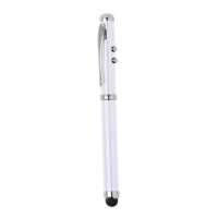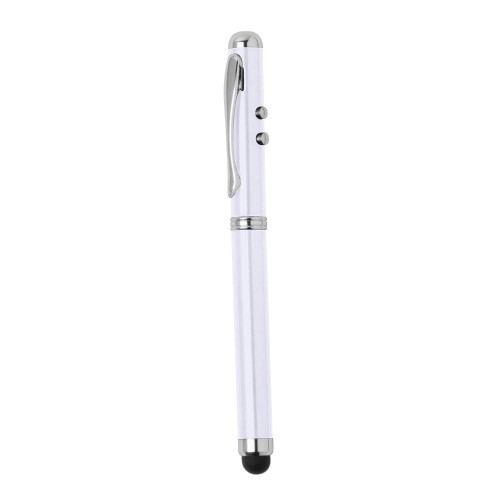 Multifunktionskugelschreiber aus Metall mit blauschreibender Mine und Clip. Dieser Kugelschreiber besteht aus einer Minitaschenlampe mit LED Licht, einem Laserpointer und hat eine Touchpen-Funktion. Geliefert in einem Geschenketui aus Metall. Enthält 3 LR41-Batterien. ø10 x 125 mm | Schachtel: 178 x 38 x 19 mm