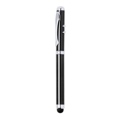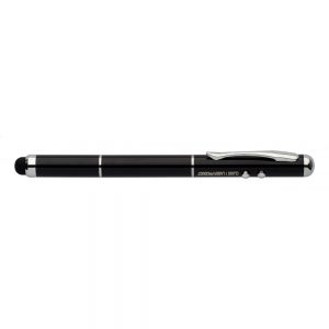 Schwarzschreibender Kugelschreiber mit Stylus-Funktion und integriertem Laserpointer sowie kleiner Leuchte.