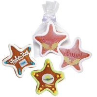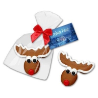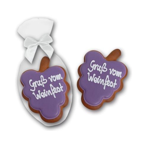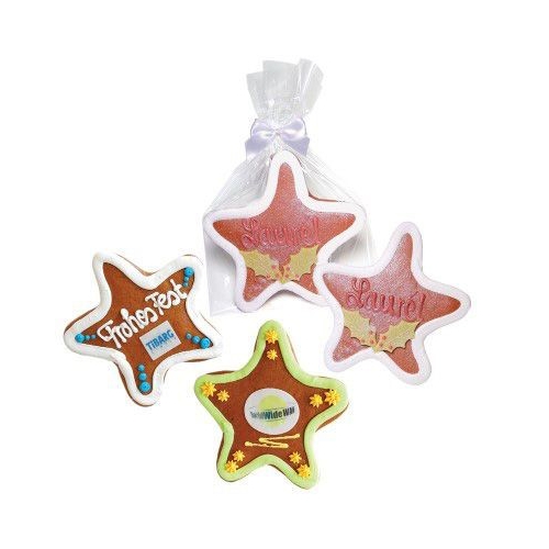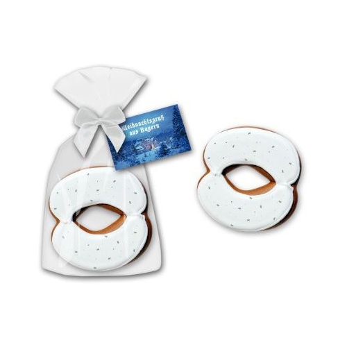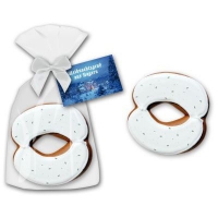Mit farbigen Zuckerguss verziert und mit farbig bedrucktem Papieraufleger versehen. Gewicht: ca. 55g Verpackung: Einzeln in Glanzfolie verschweißt und mit weißem aufgeklebtem Umhängeband versehen. Haltbarkeit: 6 Monate
