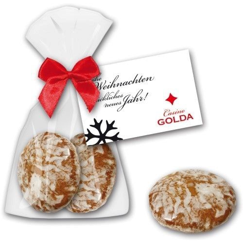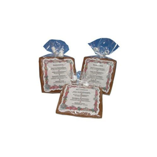 Individueller Lebkuchen mit vollflächig bedrucktem Marzipan-Fondant-Plättchen (Lebensmittelfarbe). Traditionell in Handarbeit hergestellt. Hygienisch im Glanzbeutel mit wahlweise roter oder weißer Santinschleife aufgebunden.