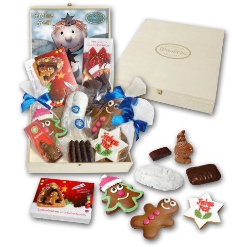 Verpackung: Lebkuchenbaum, Zuckergussstube und Schokolinsen werden in bedrucktem Karton verpackt.