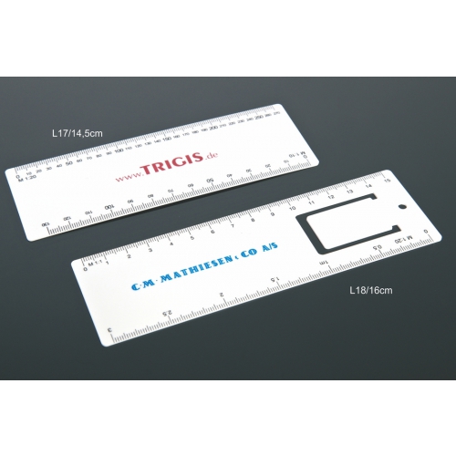 Flexibles, leichtes Plastiklineal mit Markierungen in Zoll und Zentimeter. Bitte beachten Sie, dass die Linealmarkierungen zusammen mit Ihrer Druckvorlage aufgedruckt werden, unveredelte Lineale haben keine Markierungen und sind blank.