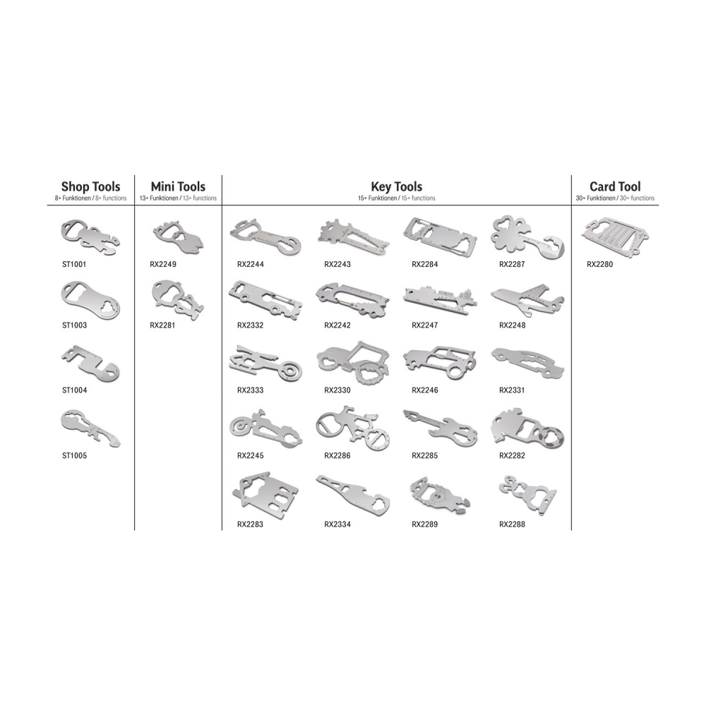 Multitool (aus robustem Edelstahl) für den Schlüsselbund inkl. Funktionsbeschreibung und Standard-Kartonverpackung, kundenindividuelle Verpackung und Funktionsbeschreibung ab 100 Stück möglich. In verschiedenen Standarddesigns verfügbar. Key Tool als Schlüsselanhänger mit 18 Funktionen: 7 Sechskantschlüssel, 2 Speichenvierkant, 1 Schlitzschraubendreher, 1 Nagelzieher, 1 Kreuzschlitzschraubendreher, 1 Flaschenöffner, 1 Zentimeter Lineal, 1 Inch Lineal, 1 Reifenprofilmesser (1,6 mm), 1 Nagelfeile, 1 Einkaufswagenlöser- ab 3.000 Stück auch als Sonderproduktion mit individueller Key Tool Form möglich. Sprechen S ...
