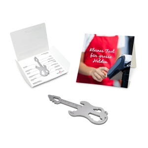 Dieses praktische Werkzeug in Kreditkartengröße zeichnet sich durch die vielseitigen Funktionen und das handliche Format aus. Dank dieser Form passt es problemlos in Portmonee, Hosentasche oder Rucksack. So ist das Werkzeug ein optimaler Begleiter für unterwegs und Outdoor-Aktivitäten. Das Multitool ist aus hochwertigem, schwarz lackiertem Edelstahl gefertigt. 8 Funktionen stehen zur Verfügung: Flaschenöffner, Dosenöffner, Lineal, Schraubendreher, Sechskantschlüssel, Winkelmesser, Paketöffner und Flügelmutter-Dreher. Mit diesem Multitalent ist man für jede alltägliche Eventualität bestens gerüstet. Werbeanbri ...