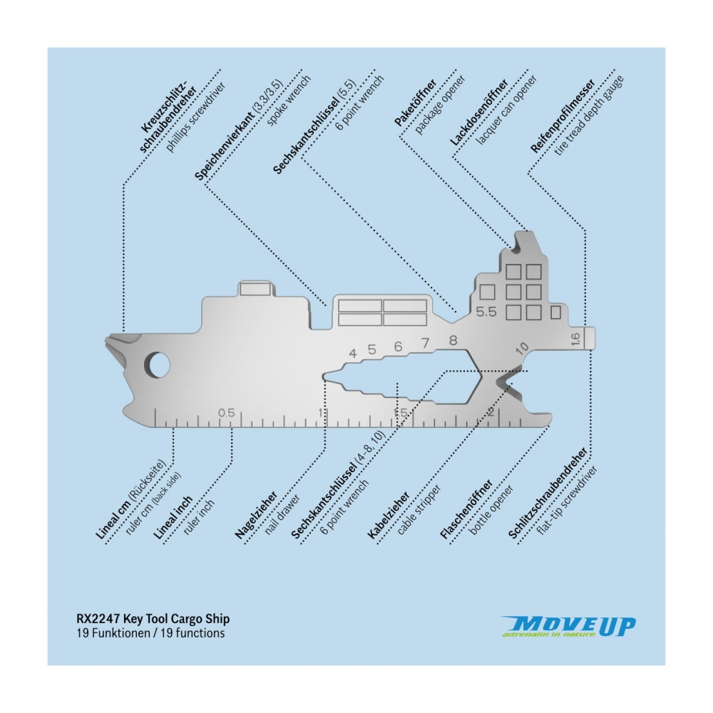 Multitool (aus robustem Edelstahl) für den Schlüsselbund inkl. Funktionsbeschreibung und Standard-Kartonverpackung, kundenindividuelle Verpackung und Funktionsbeschreibung ab 100 Stück möglich. In verschiedenen Standarddesigns verfügbar. Key Tool als Schlüsselanhänger mit 19 Funktionen: 7 Sechskantschlüssel, 2 Speichenvierkant, 1 Schlitzschraubendreher, 1 Nagelzieher, 1 Kreuzschlitzschraubendreher, 1 Kabelzieher, 1 Flaschenöffner, 1 Zentimeter Lineal, 1 Inch Lineal, 1 Reifenprofilmesser (1,6 mm), 1 Lackdosenöffner, 1 Paketöffner - ab 3.000 Stück auch als Sonderproduktion mit individueller Ke ...