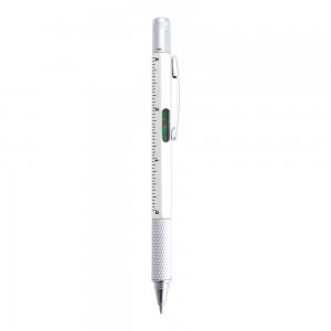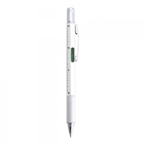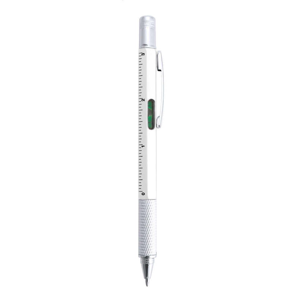 Kunststoffkugelschreiber, blauschreibend, mit Metallclip. Funktionen: Schlitz- und Kreuzschraubendreher, Wasserwaage, und 7cm- / 3 Zoll-Linealen.