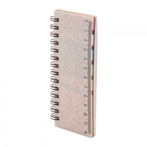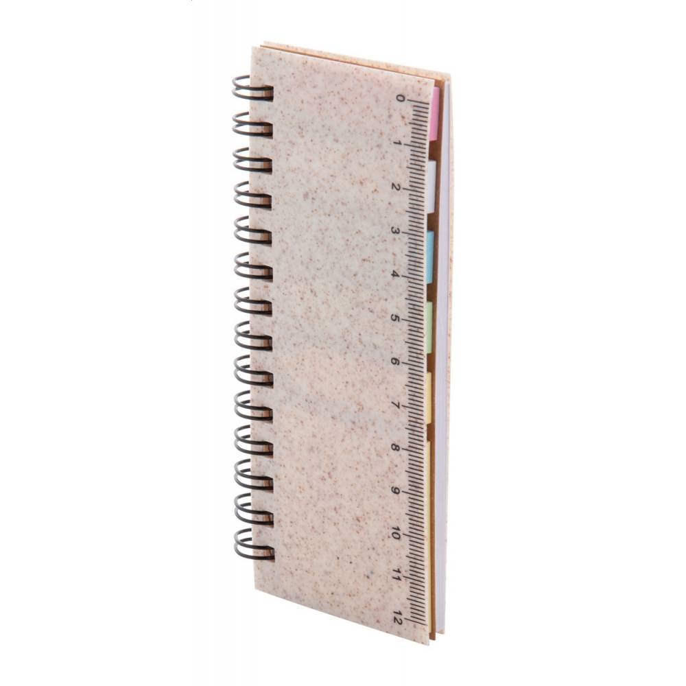 Ökologisches, mit Einband aus Weizenstrohkunststoff, Spiralnotizbuch mit 40 linierten Blättern aus Recyclingpapier, 25 Haftnotizen und 125 Seitenmarkern (in 5 verschiedenen Farben). Mit 12 cm Lineal auf dem Einband.