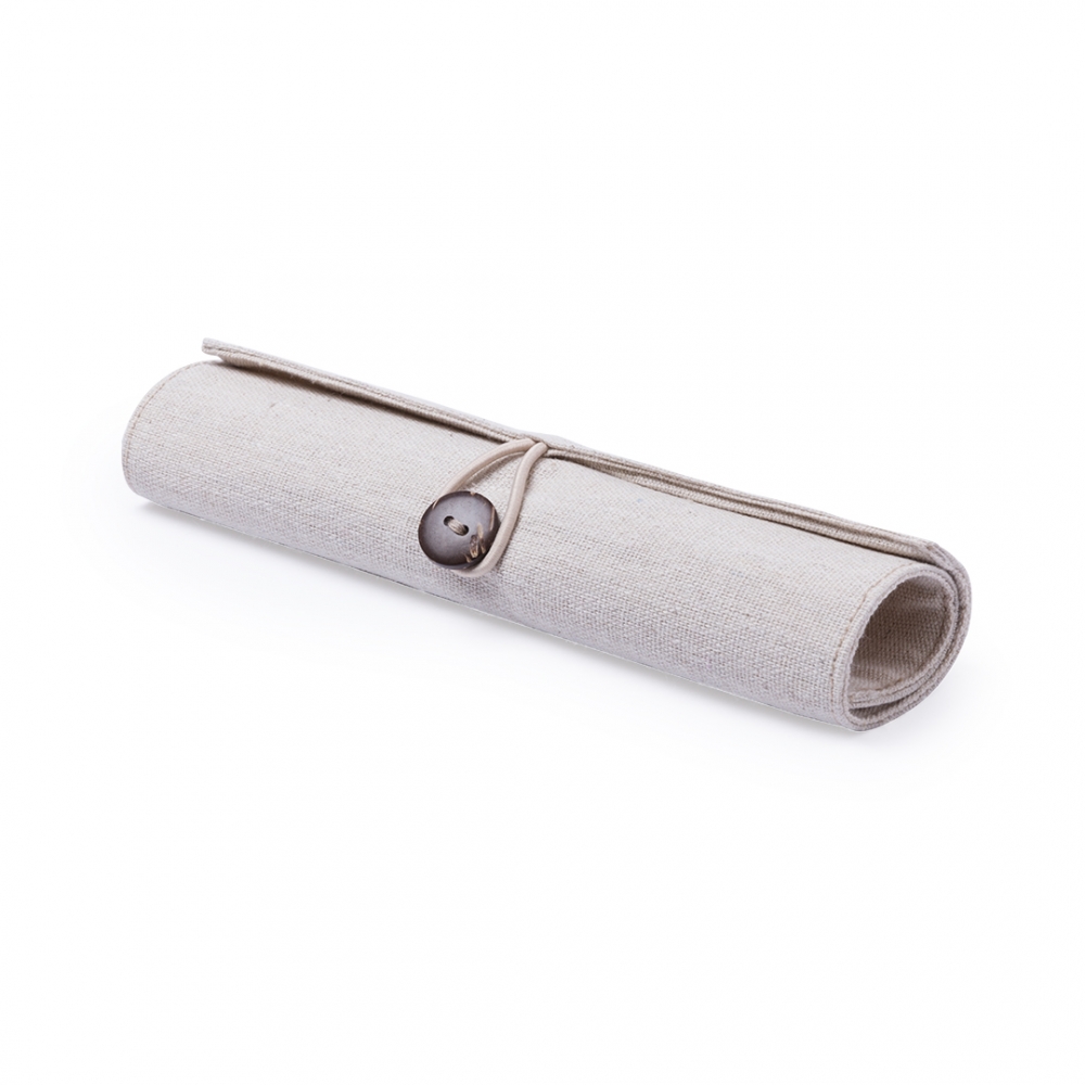 Originelles Etui der Linie Nature aus Baumwolle und Jutefasern. Mit elegantem Knopfverschluss. Enthält Zubehör in Naturfarbe: Radiergummi, Anspitzer, Kugelschreiber aus Recyclingkarton, Holzbleistift und Holzlineal.