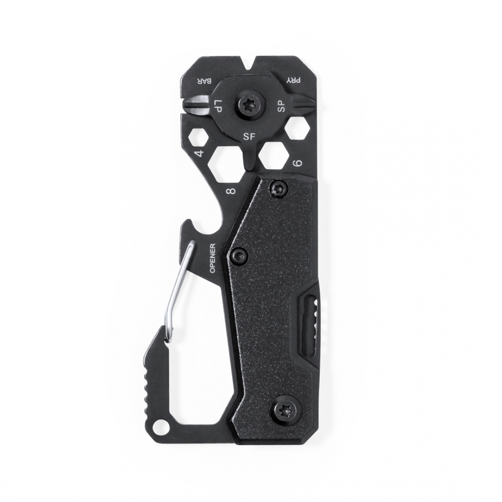 Hervorragendes Multitool aus Aluminium und Edelstahl mit schwarzer Oberfläche. Mit 13 verschiedenen Funktionen: Schraubenschlüssel für Sechskantmuttern in verschiedenen Größen, Karabiner, Dosenöffner, Lineal, Schaber, Messer, Flach- und Kreuzschlitzschraubendreher. Präsentiert in einer Kraft-Design-Box.