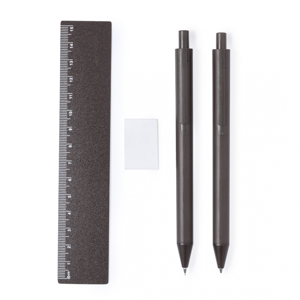 Set aus Kugelschreiber, Druckbleistift und Lineal, aus Kaffeefaser. Kugelschreiber mit blauer Tinte und Druckbleistift mit 2 x 0,7 mm Minen, beide mit Clip. Inklusive praktischem 15-cm-Lineal und nützlichem Radiergummi. Präsentiert in einem individuellen Etui aus Kaffeefasern. Kaffeefaser-Logo auf der Oberseite von Kugelschreiber und Druckbleistift. Kaffeefaser ist eine Kreislauflösung, die aus der Verwendung von Abfällen der Kaffeeproduktion gewonnen wird. Eine nachhaltige Alternative, die die Reduzierung des Plastikverbrauchs fördert, bei der Herstellung Energie spart und zum Umweltschutz beiträgt.