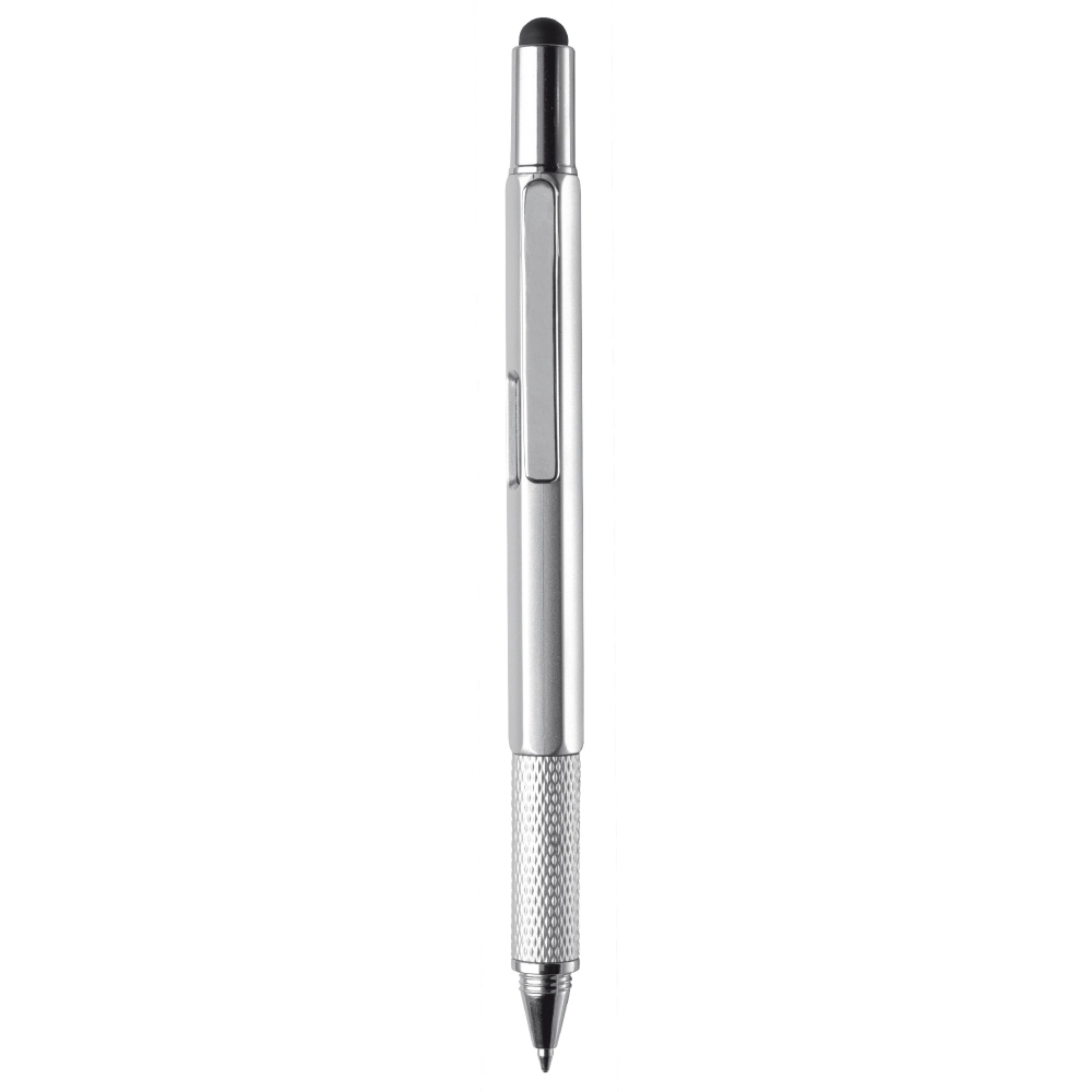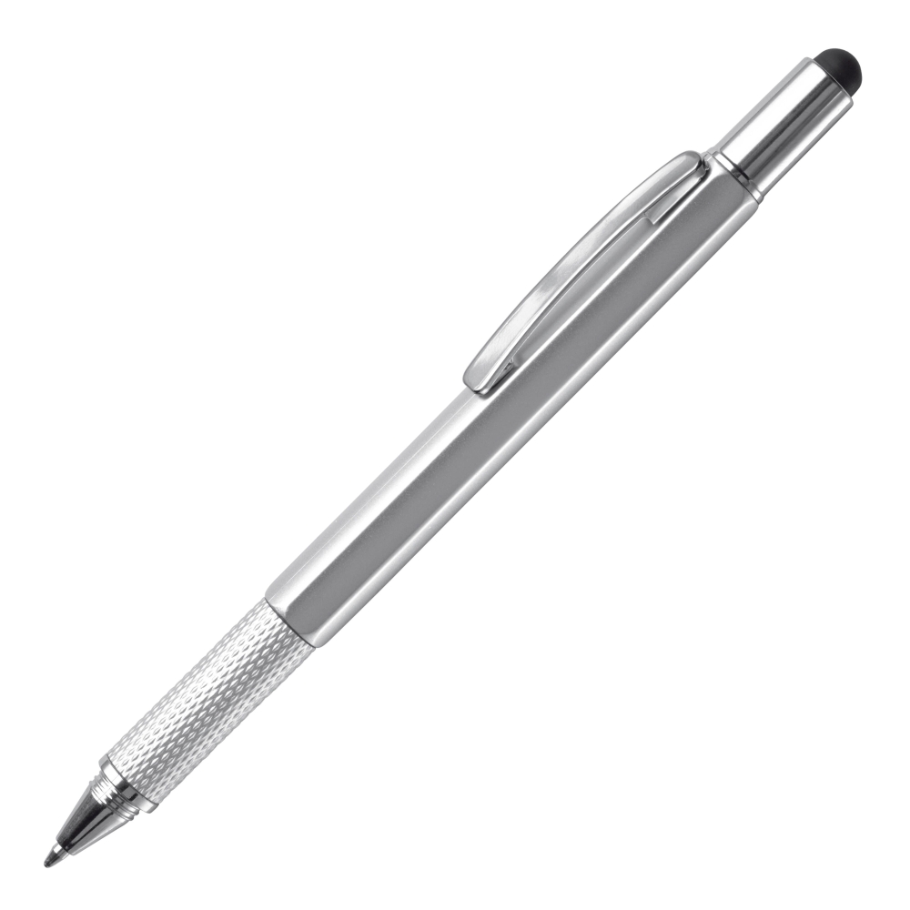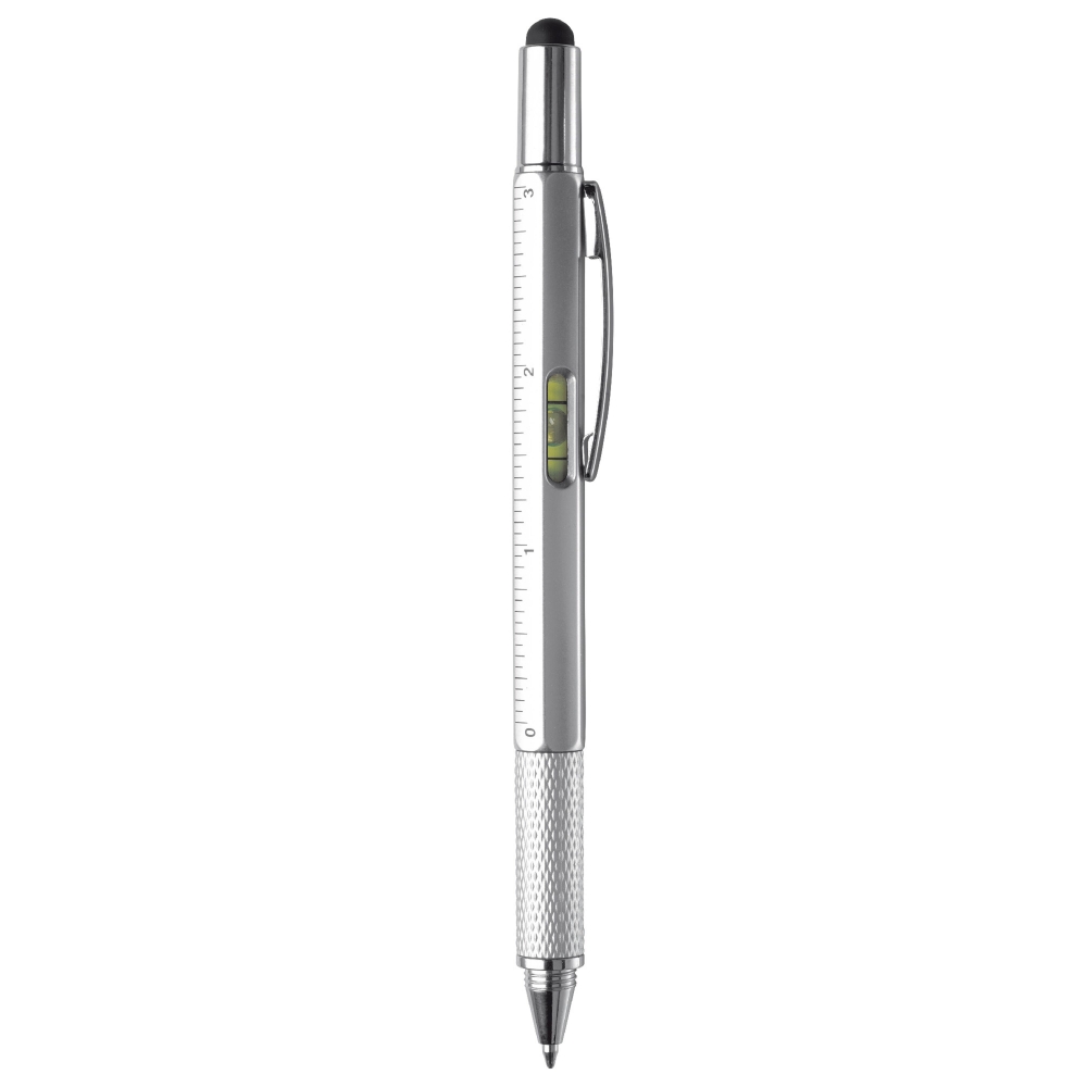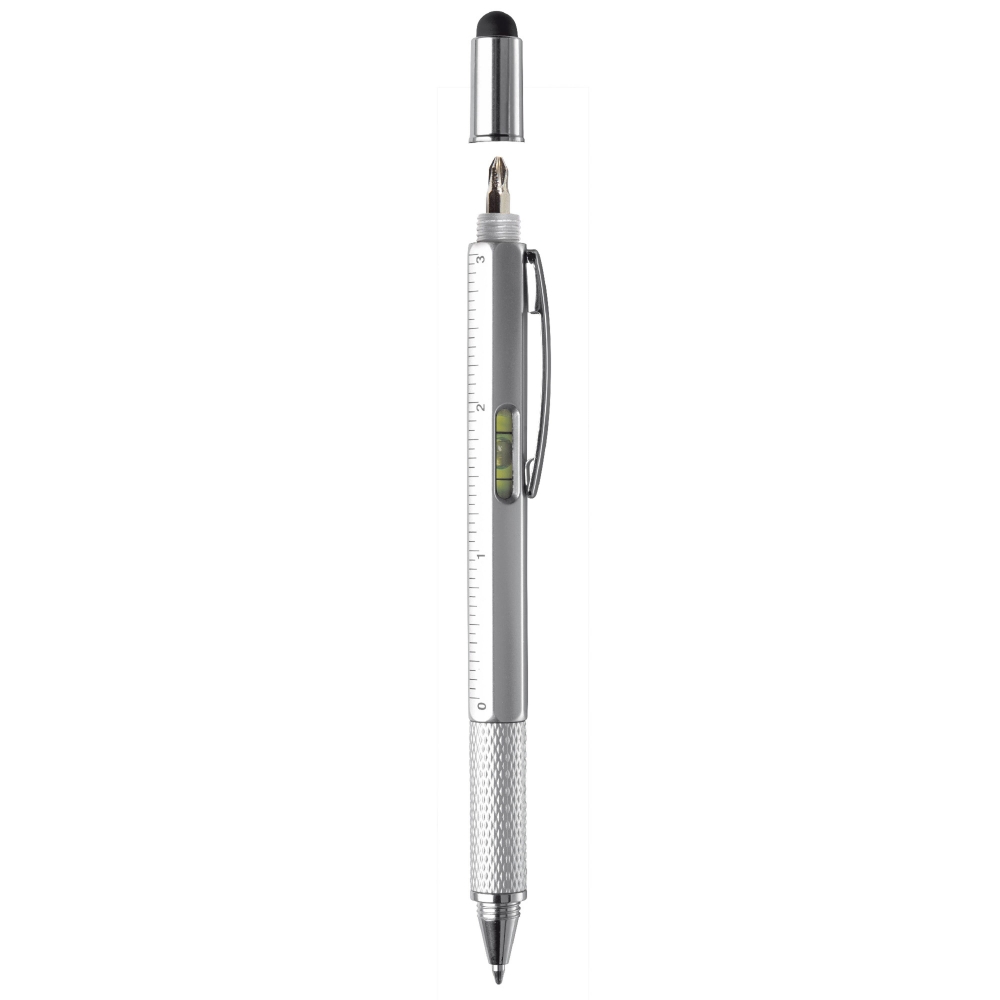 Multifunktionaler Kugelschreiber mit Touchspitze, inklusive Wasserwaage, Schraubendreher und Lineal. Blauschreibend.