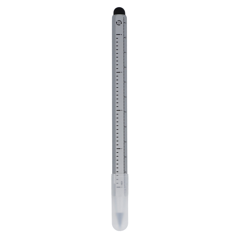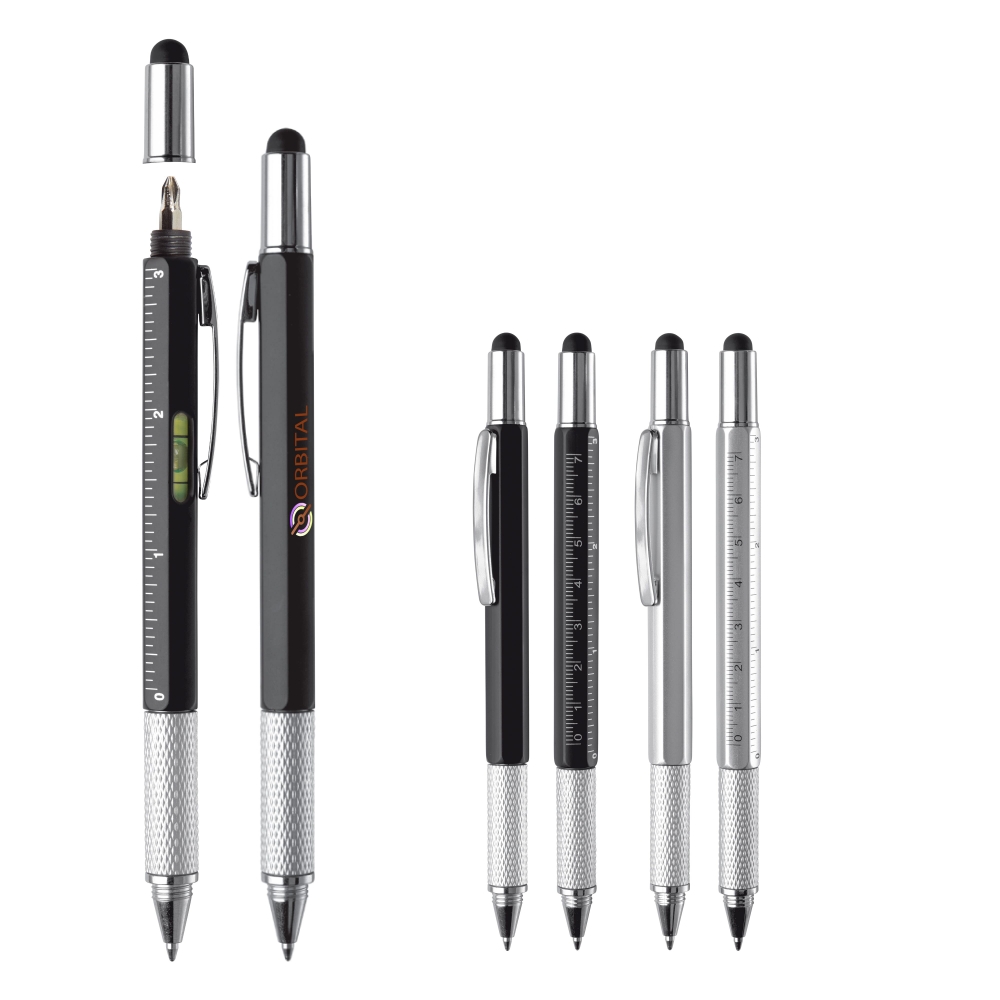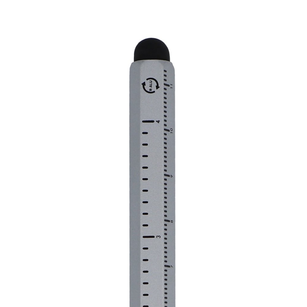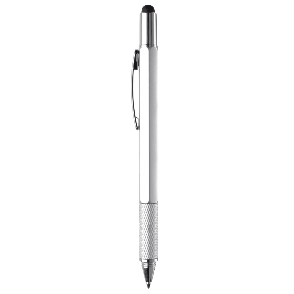 Multifunktionaler Kugelschreiber mit Touchspitze, inklusive Wasserwaage, Schraubendreher und Lineal. Blauschreibend.