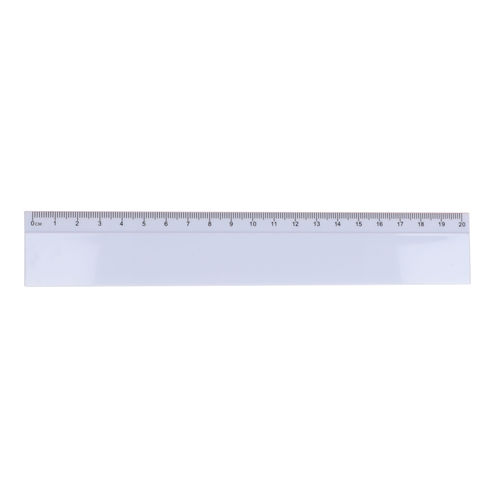 Stabiles 20 cm langes Lineal aus Kunststoff mit erhaben geprägter mm-Skala auf einer Seite. Standardmäßig ohne Druck. Loch auf einer Seite.