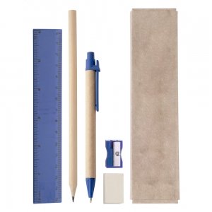 Schreib- und Zeichenset mit drei Bleistiften mit verschiedenen Härtegraden, Lineal, Radiergummi und Spitzer. Die Werbung wird auf der Verpackung angebracht.
