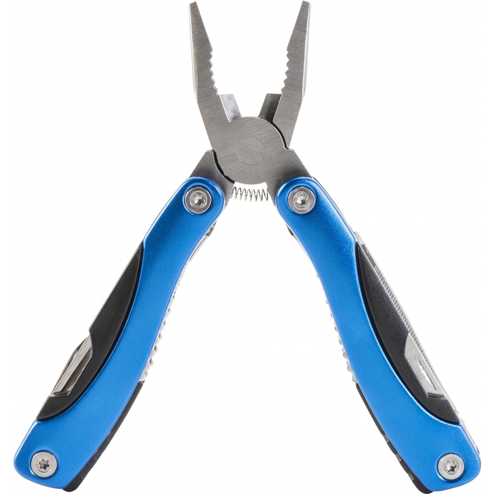 Multifunktionswerkzeug aus Metall und Kunststoff. Funktionen: Zange, Säge, Messer, zwei Schraubendreher (Kreuz und Schlitz), Feile, Flaschen- und Dosenöffner, Fischschaber, Nussknacker und Lineal mit Zoll-Angabe. In einem kleinen Beutel geliefert.