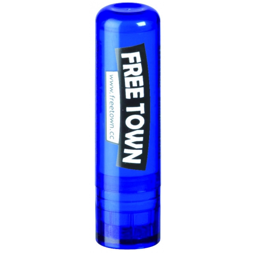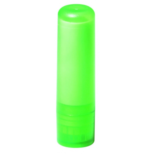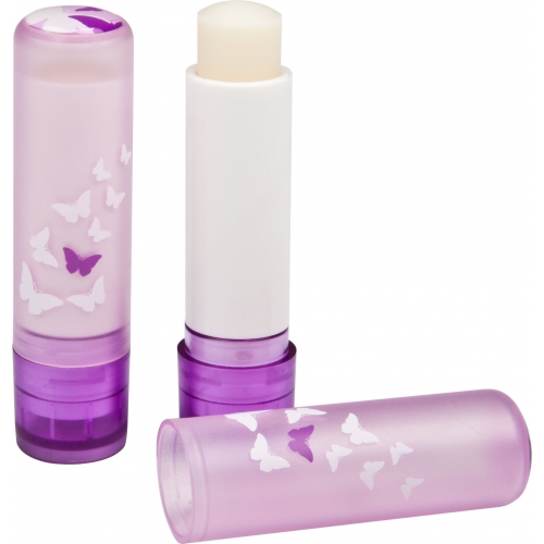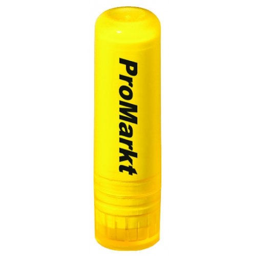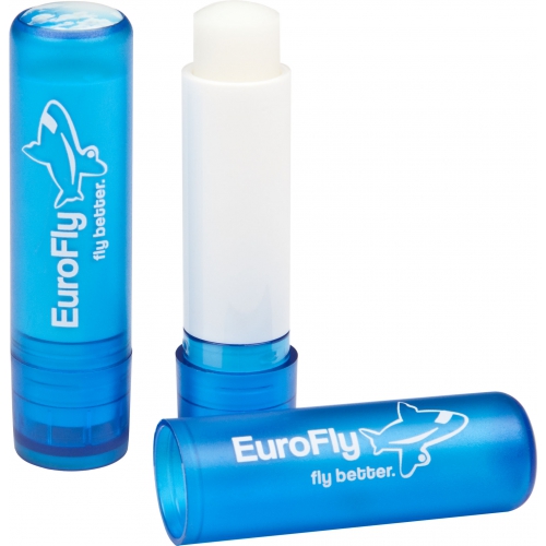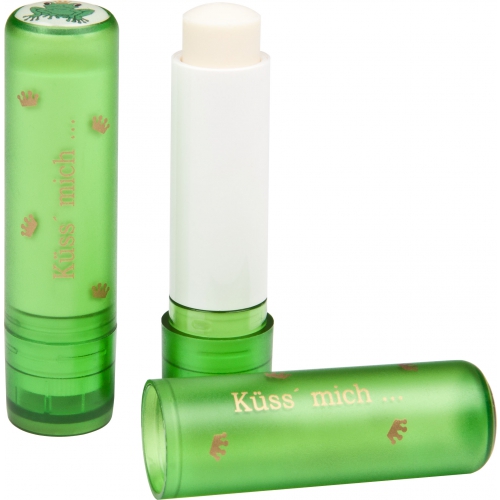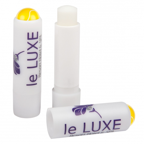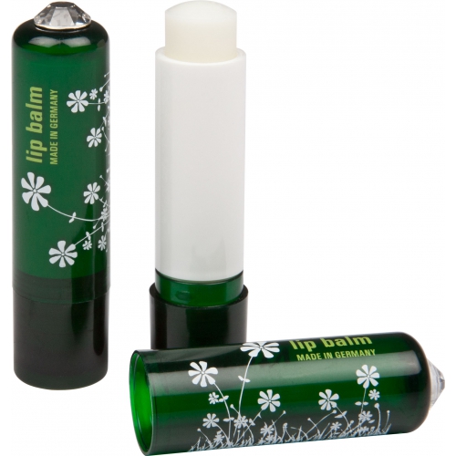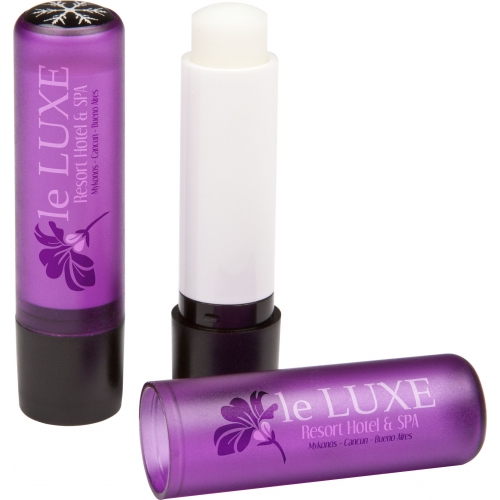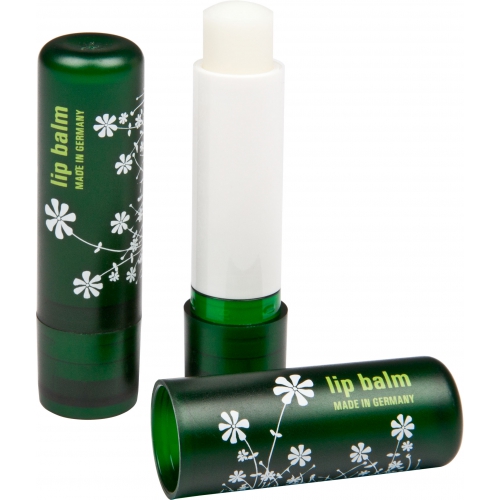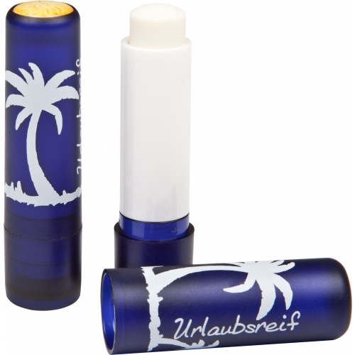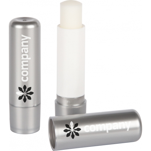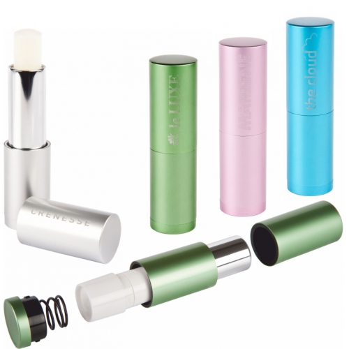 Lippenbalsam (SPF15) in einem runden Gehäuse. An der Unterseite des Stifts ist ein Drehmechanismus zum herausdrehen des Pflegestifts. Lieferbar in transparenten Farben oder einfarbig in schwarz oder weiß.