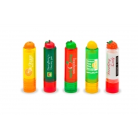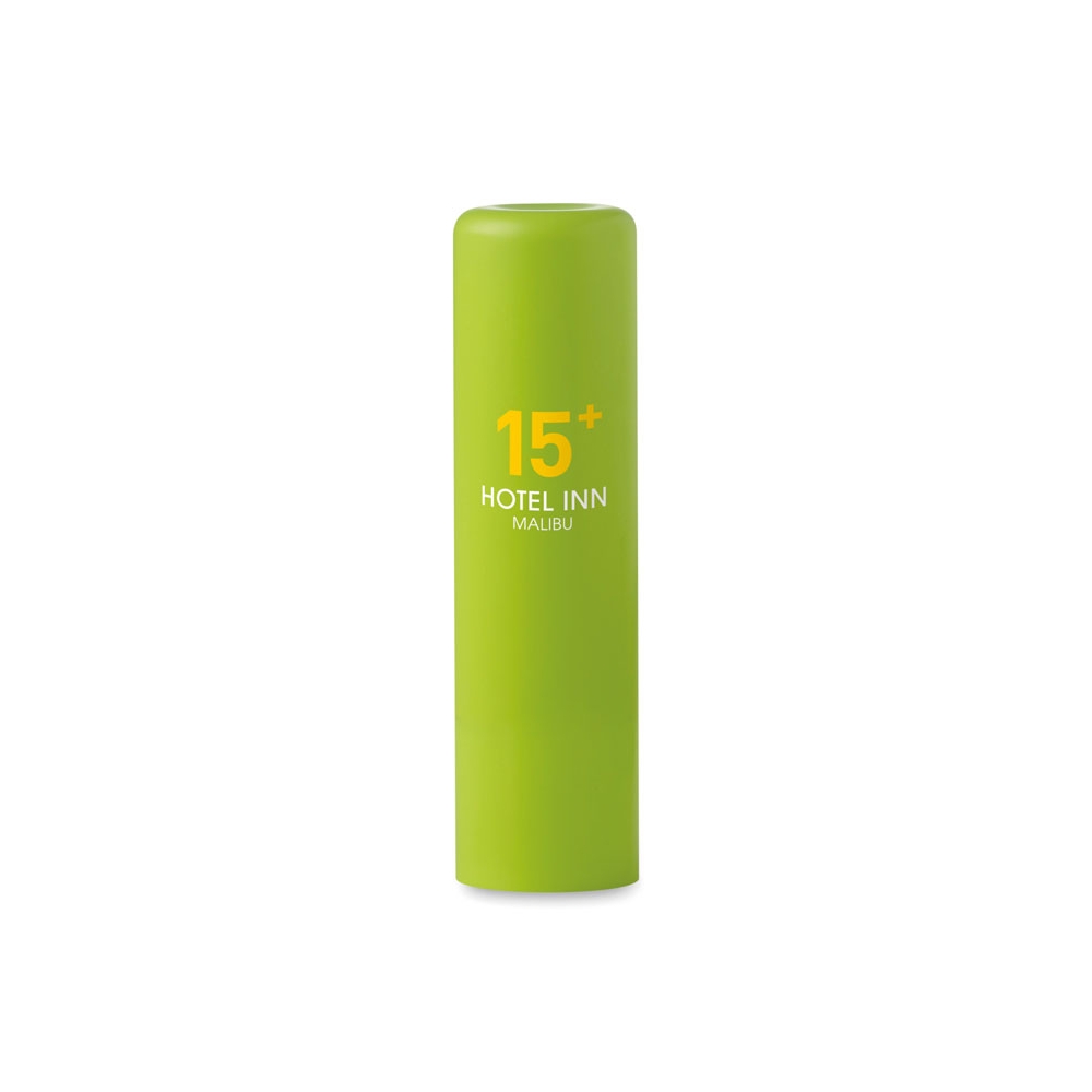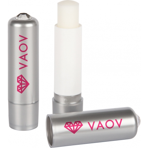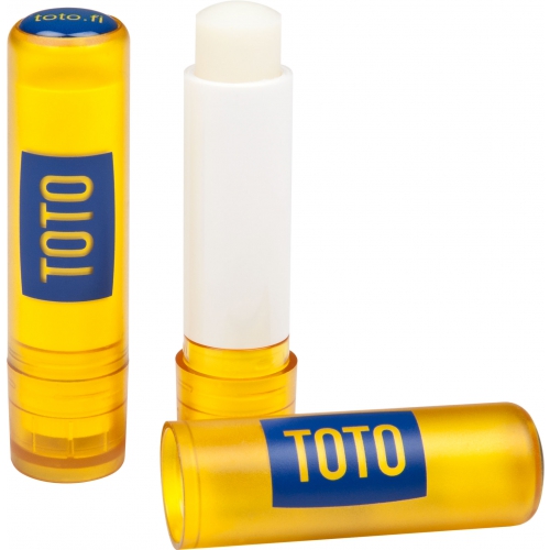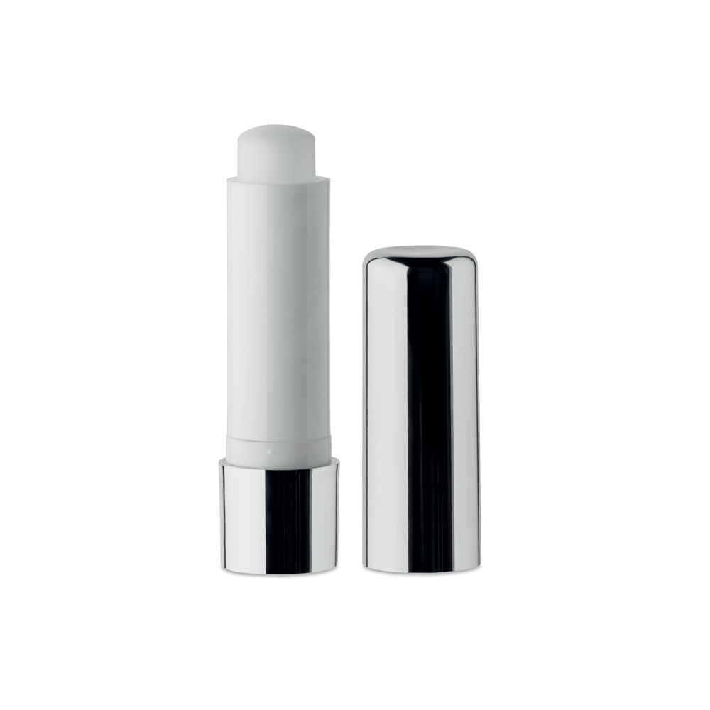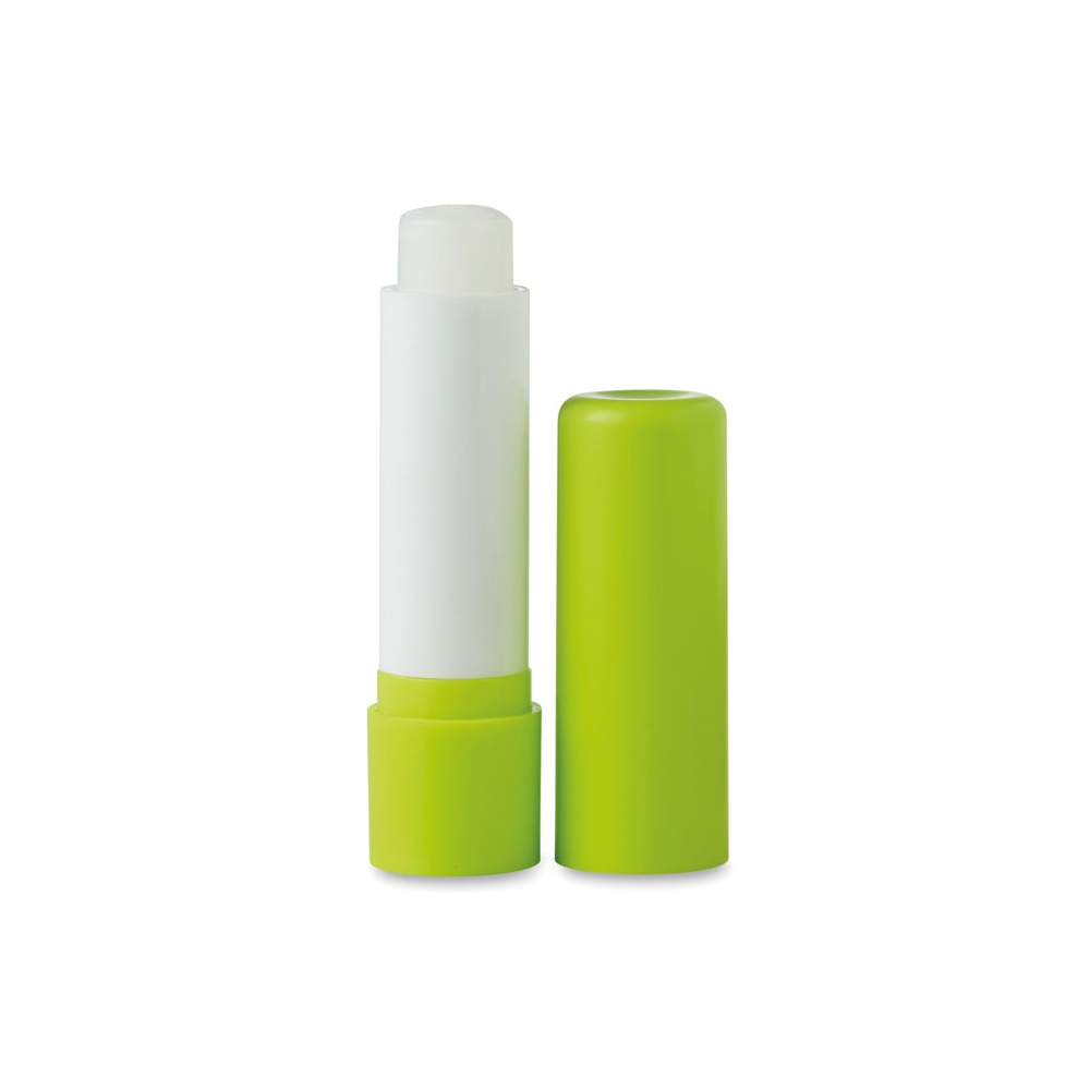 Lippenbalsam (SPF15) in einem runden Gehäuse. An der Unterseite des Stifts ist ein Drehmechanismus zum herausdrehen des Pflegestifts. Lieferbar in transparenten Farben oder einfarbig in schwarz oder weiß.