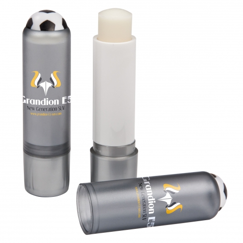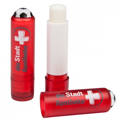 Lippenpflegestift mit 3D Fußball Applikation auf der Kappe. Langlebiger, persönlicher Werbeartikel mit positivem Image, für Männer und Frauen. Handlich und ganzjährig nutzbar. Die hochwertige Lippenpflege Planty (ohne mineralische Öle und Wachse) wird in Deutschland nach Kosmetikverordnung und Kosmetik GMP produziert. Gegen Aufpreis auch mit LSF 20.
