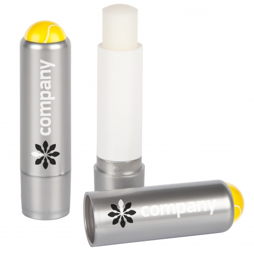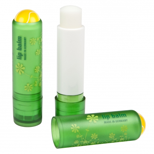 Lippenpflegestift mit 3D Tennisball Applikation auf der Kappe. Langlebiger, persönlicher Werbeartikel mit positivem Image, für Männer und Frauen. Handlich und ganzjährig nutzbar. Die hochwertige Lippenpflege Planty (ohne mineralische Öle und Wachse) wird in Deutschland nach Kosmetikverordnung und Kosmetik GMP produziert. Gegen Aufpreis auch mit LSF 20.