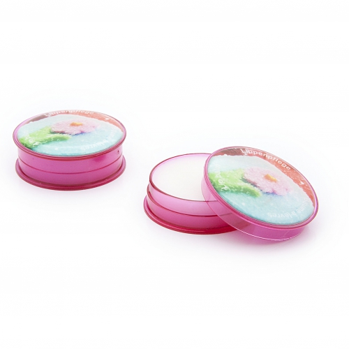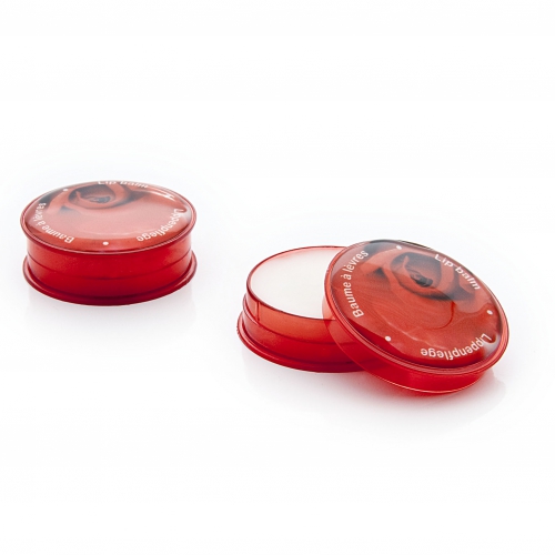 Lippenbalsam in runder Box. Perfekt für unterwegs. In verschiedenen Duftrichtungen. Abmessung: Ø3,8 cm. Druckgröße: 15x15 mm. Erhältlich in den abgebildeten Farben.