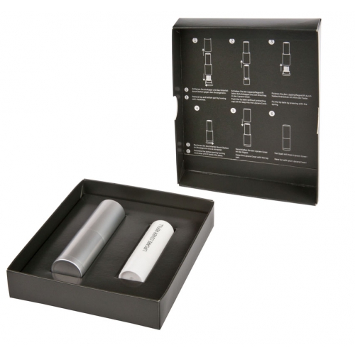 Lippenpflegestift in edler Metallhülle inkl. Gravur. Durch das patentierte Stecksystem mit jedem handelsüblichen Pflegestift nachfüllbar. In neutraler Stülpdeckelschachtel inklusive erster Befüllung, Nachfüllstift und Anleitung. Langlebiger, persönlicher Werbeartikel mit positivem Image, für Männer und Frauen. Handlich und ganzjährig nutzbar. Die hochwertige Lippenpflege Planty (ohne mineralische Öle und Wachse) wird in Deutschland nach Kosmetikverordnung und Kosmetik GMP produziert. Gegen Aufpreis auch mit LSF 20. Viele attraktive Farben für den Lippenpflegstift: apple green, soft pink, cool blue, light silver