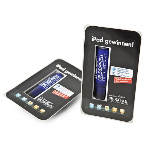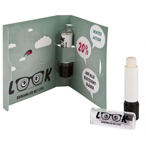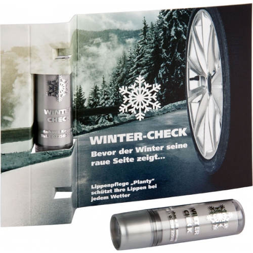 Lippenpflegestift 'Lipcare Original' inkl. 1c Druck mit beidseitig individuell 4c bedruckter Karte für Mailings und Flyer-Aktionen. Die 'Lipcare Card' bietet viel Platz für alle Aussagen, die nicht auf einen Lippenpflegestift passen. Langlebiger, persönlicher Werbeartikel mit positivem Image, für Männer und Frauen. Handlich und ganzjährig nutzbar. Die hochwertige Lippenpflege Planty (ohne mineralische Öle und Wachse) wird in Deutschland nach Kosmetikverordnung und Kosmetik GMP produziert. Gegen Aufpreis auch mit LSF 20.