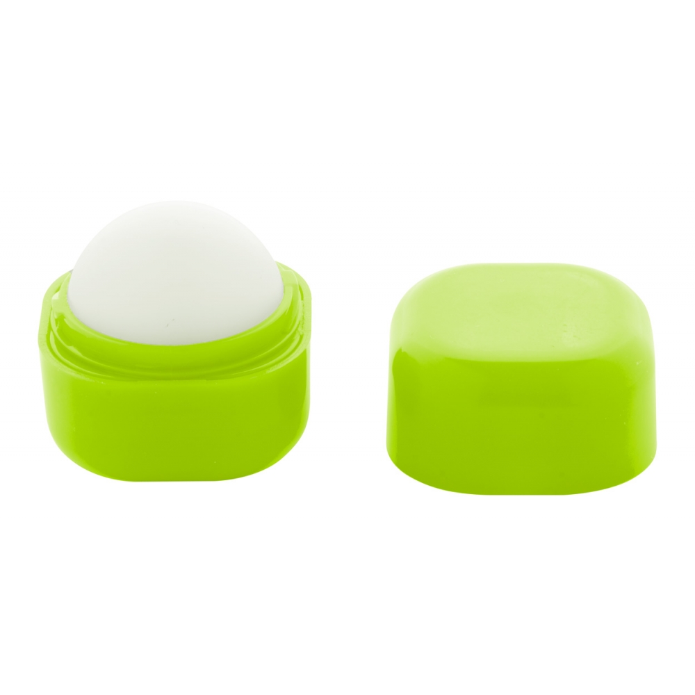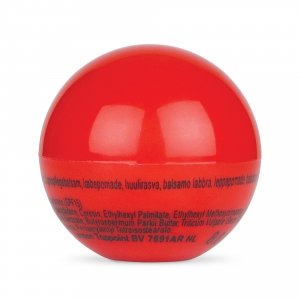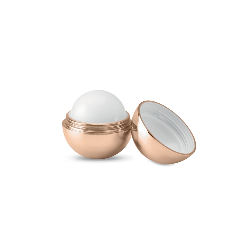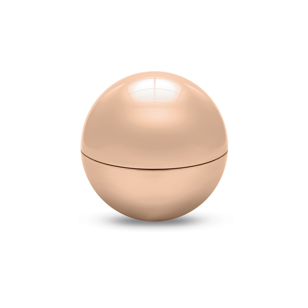 Lippenbalsam in einer kugelförmigen Kosmetikdose. Die Dose kann durch Drehen des Deckels geöffnet werden. Durch die flache Unterseite kann die Kugel nicht wegrollen.