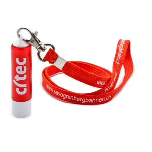 Lippenpflegestift mit farblich wählbarem Clip und neutralem Lanyard, 1c-Druck auf Lanyard gegen Aufpreis möglich. Langlebiger, persönlicher Werbeartikel mit positivem Image, für Männer und Frauen. Handlich und ganzjährig nutzbar. Die hochwertige Lippenpflege Planty (ohne mineralische Öle und Wachse) wird in Deutschland nach Kosmetikverordnung und Kosmetik GMP produziert. Gegen Aufpreis auch mit LSF 20.
