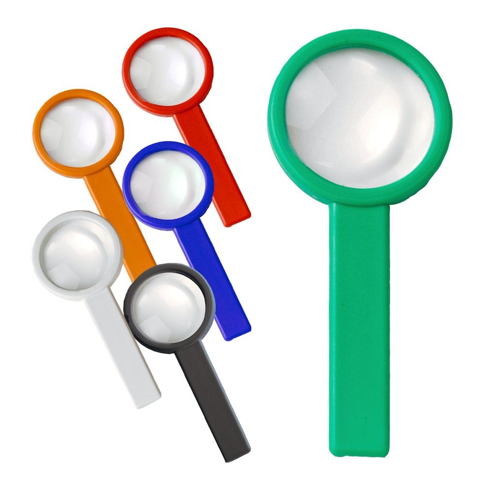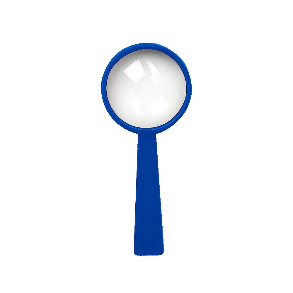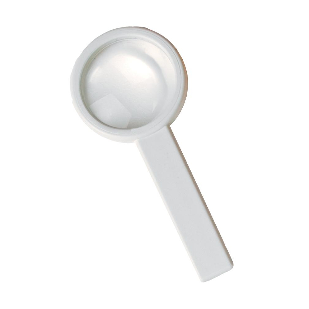 Lupe aus stabilem Kunststoff mit einem Durchmesser von 50 mm, 3-facher Vergrößerung und Stiel zum bequemen Halten.