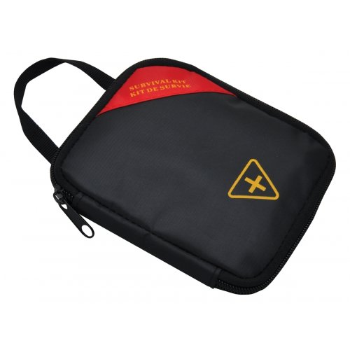 Rot-schwarze Tasche aus wasserabweisendem Polyester inklusive: einer Survivalkarte mit 12 Funktionen (#ECO008), 2 Skalpelle, eine Notfallpfeife aus rotem Kunststoff mit Umhängeband, ein Kompass-Schlüsselanhänger, ein wasserdichtes Behältnis mit Sicherheitsspiegel im Deckel, ein Notfall-Zündstein und ein Zündstreifen mit 6 Streichhölzern, eine Teelicht-Kerze, 2 Wattebäusche, 5 Sicherheitsnadeln, eine Lupe, ein Näh-Set, ein Angelset (bestehend aus 2 Nylonfäden, 3 verschiedene Angelhaken und 2 Lote), ca. 1 Meter Kupferschnur (um z.B. eine Schlinge zu formen)