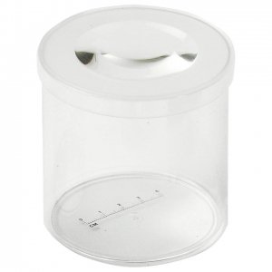 Behälter aus transparentem Kunststoff (transparenter Teil aus PS+ bunter Teil aus ABS). Deckel mit Lupe und 8 kleinen Luftlöchern. Skalierung auf dem Boden des Behälters (5 mm). Kapazität: 16,5 cl.