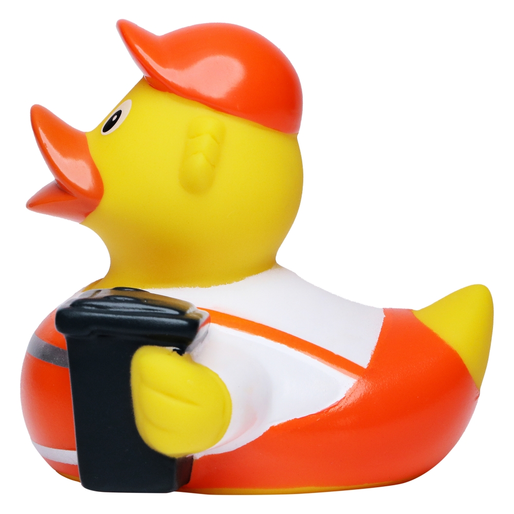 Artikel-Nr: GUT31260Quietsche-Ente Müllmann sorgt zumindest visuell für Ordnung im Alltag. Charmant macht er seinen Job und bringt ganz nebenbei noch 8 cm geballte Power und Geschmacksmusterschutz mit. Bis ins Detail schlüpft dieses Schnabels® Exemplar in das bekannte Müllmann-Outfit und bringt sorgar eine kleine Mülltonne mit.