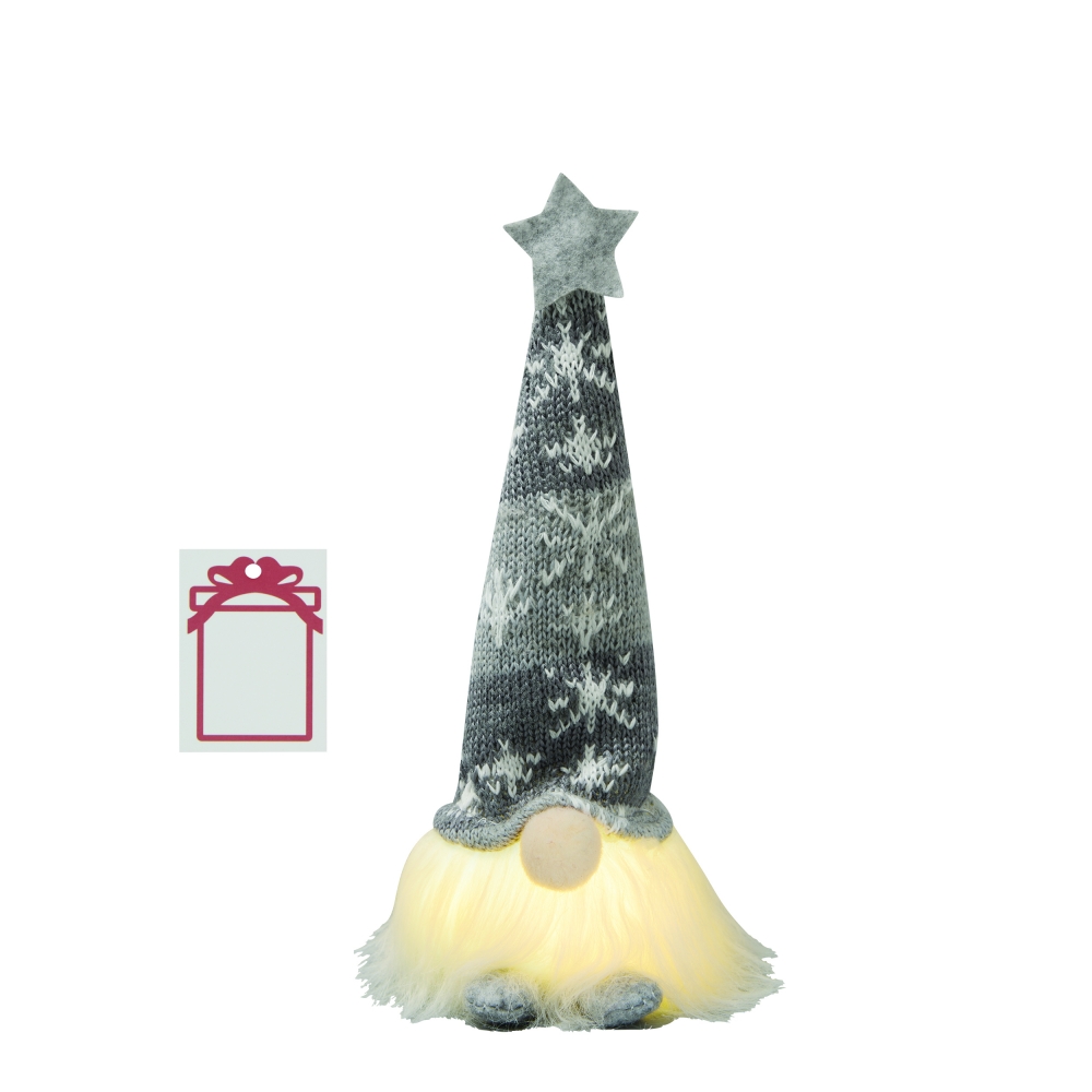 Weihnachts-Wichtel EMIL, mit Licht: Woll-Zipfelmütze, Mütze lässt sich durch integrierten Draht beliebig formen, mit an- und ausschaltbarer Beleuchtung, batteriebetrieben (2x LR44 Knopfzellen enthalten), mit Geschenkanhänger zum Bedrucken