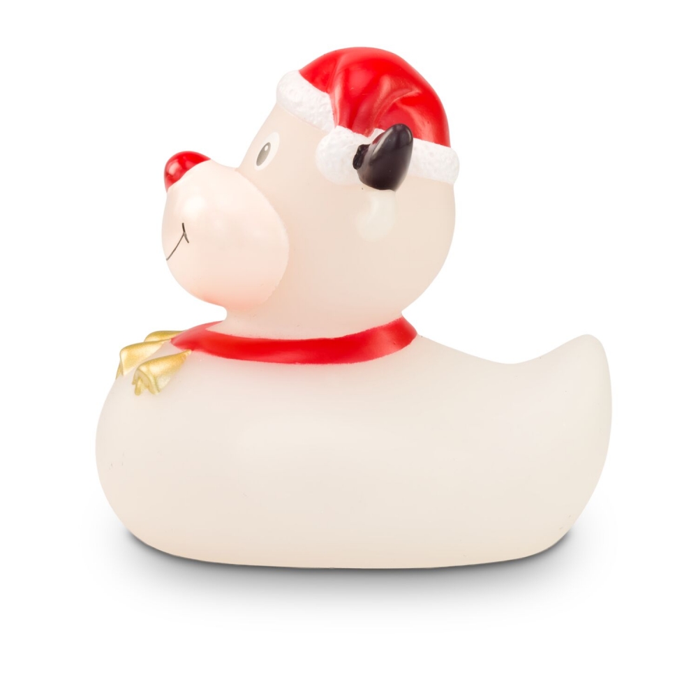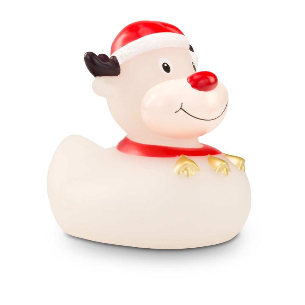 Weihnachten kann kommen, denn Rudolph Rentier bringt mit seiner typisch roten Nase, der roten Weihnachtsmütze mit Bommel und dem roten Halsband mit drei goldenen Glöckchen weihnachtliche Stimmung ins Bad. Eine originelle, winterliche Quietschfigur, die nur durch seinen weiß-gefrosteten Körper an eine Badeente erinnert. Tipp: Siehe auch seinen Bruder "Rudolph Rentier Braun" in der klassisch, braunen Version. Größe: ca. 8 cm. Inklusive Quietschventil