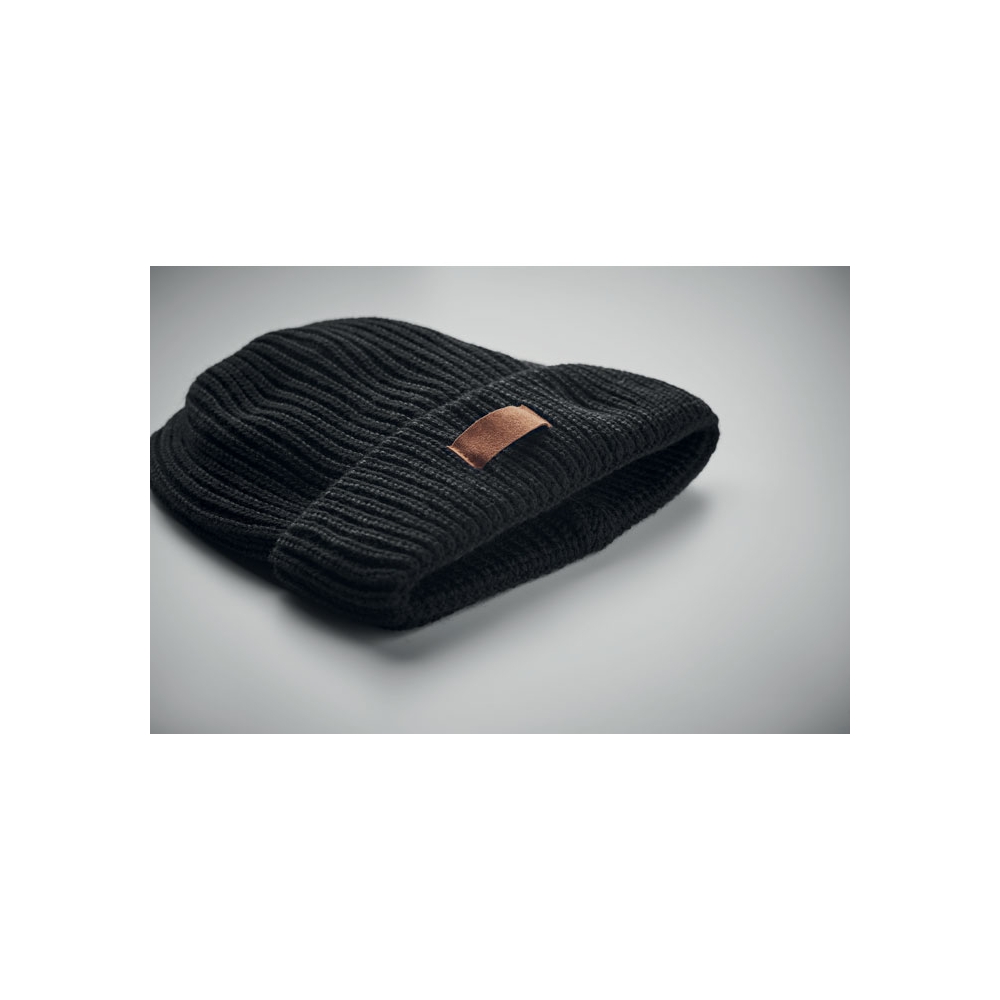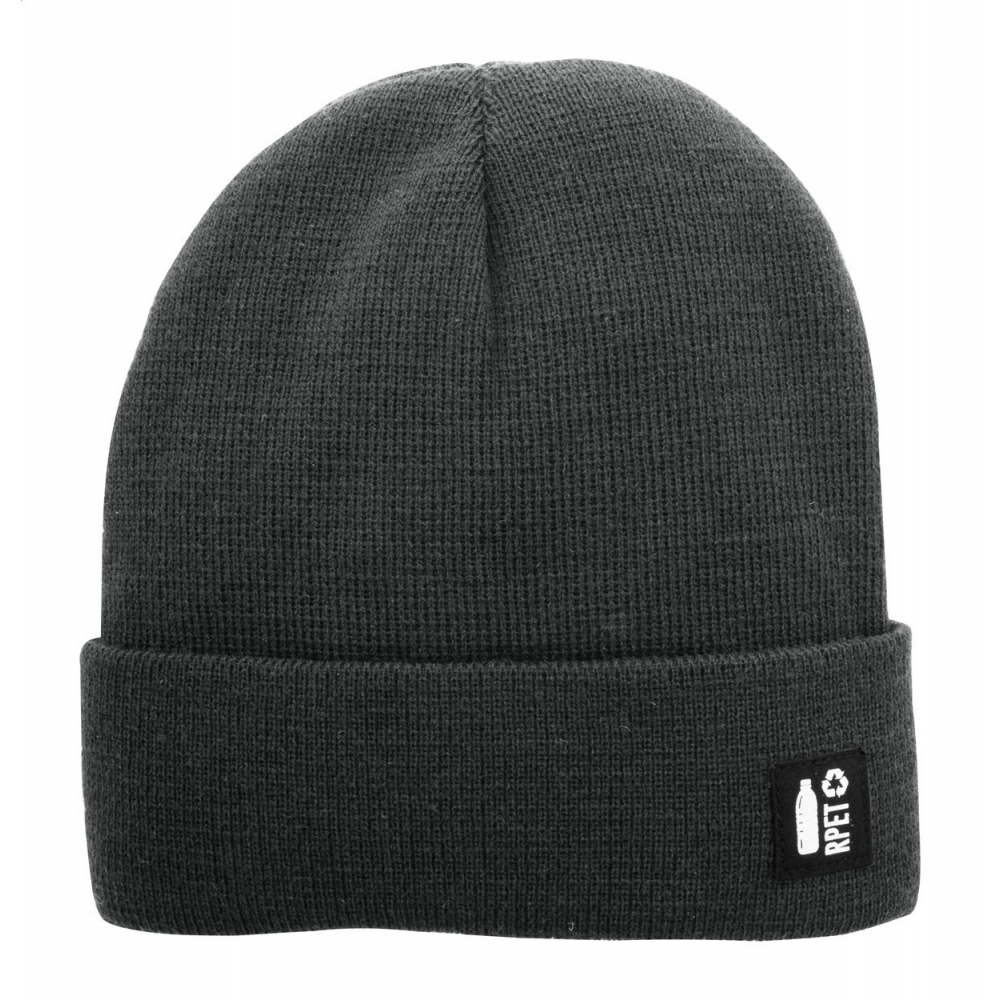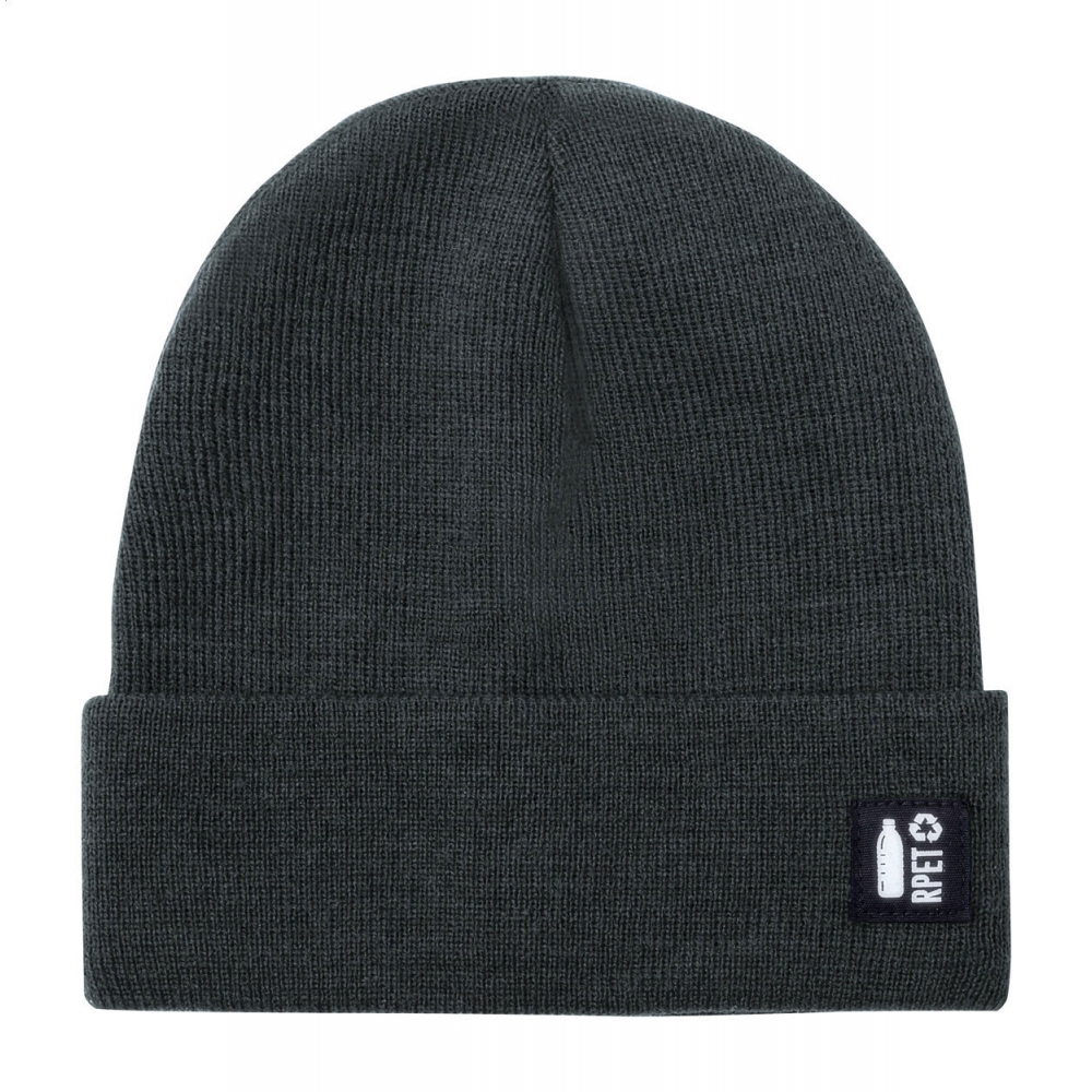 Gestrickte Mütze mit Umschlag. Aus 100% RPET-Polyester. Beliebt, herrlich warm und von guter Qualität. Einheitsgröße. Mit schwarzem Etikett zur Dekoration. GRS-zertifiziert. Recyceltes Material insgesamt: 100%.