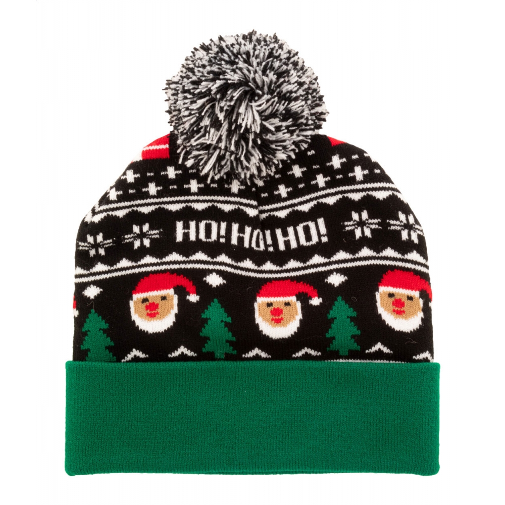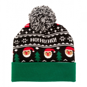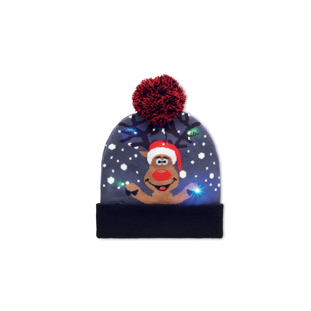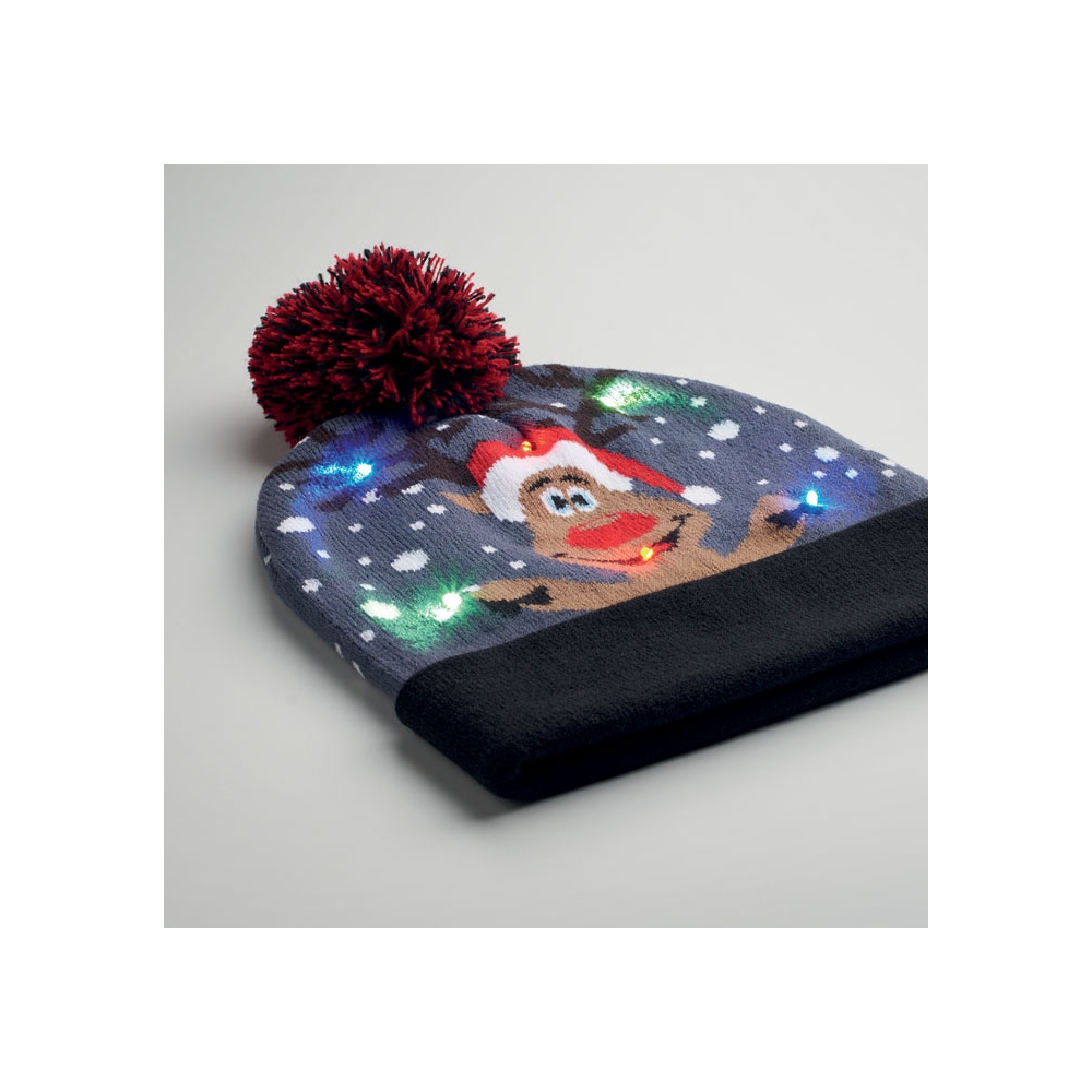 Gestrickte Weihnachtsmütze aus Acryl mit 6 LED-Leuchten (3 Leuchtmodi), Bündchen und Bommel. Mit Knopfzellenbatterie.