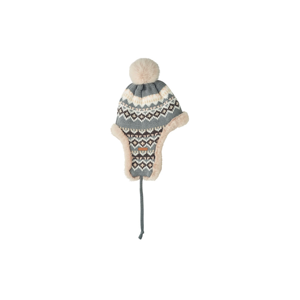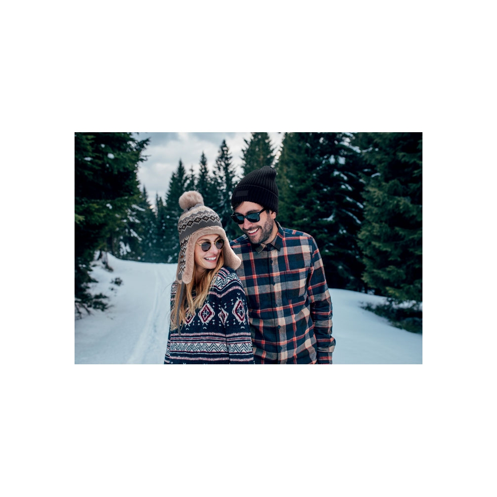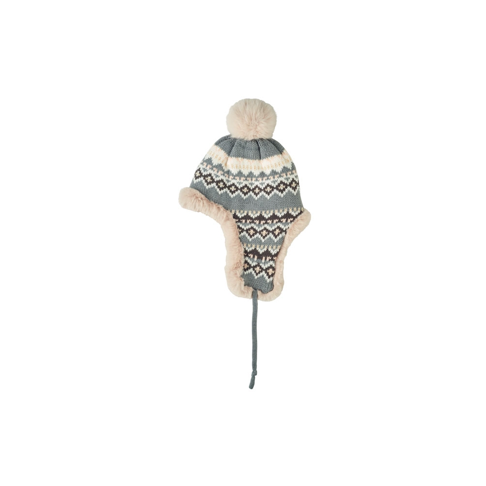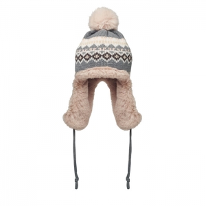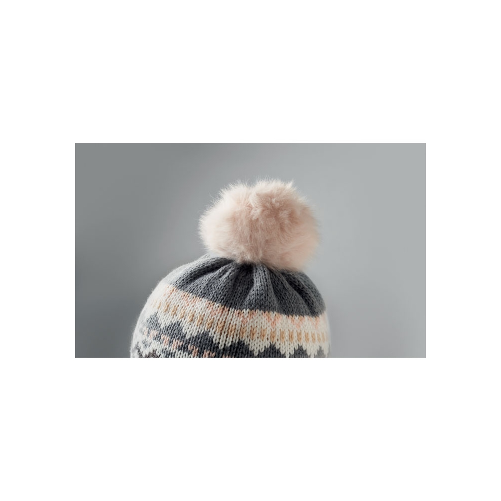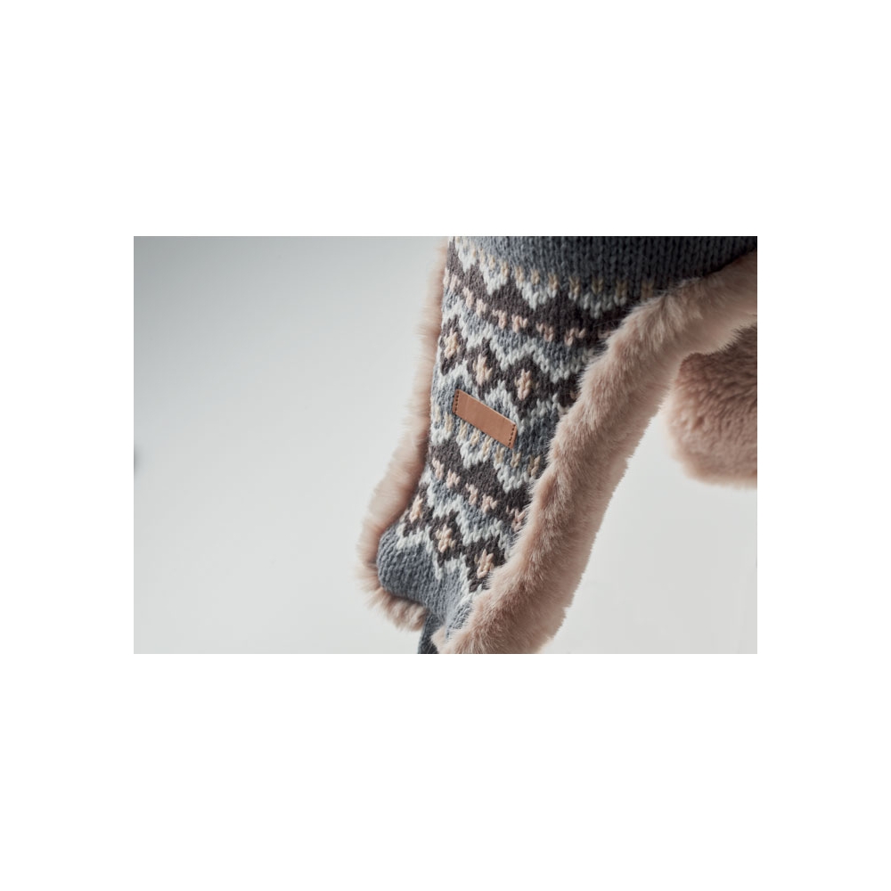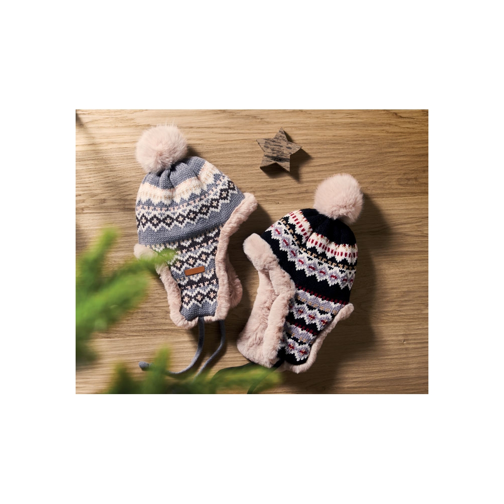 Gestrickte Mütze mit Ohrenklappen und Bommel aus Acrylfaser mit Polyester- und Fleece-Futter. Mit Label zur Werbeanbringung. Einheitsgröße.