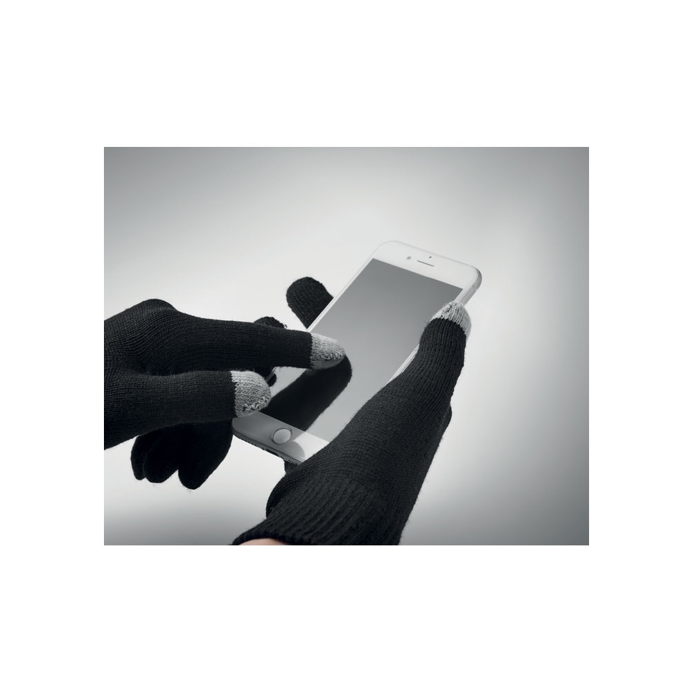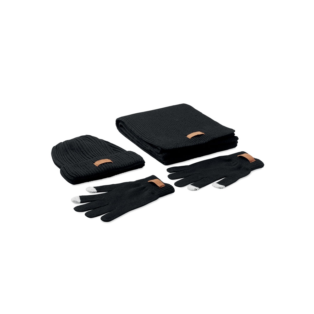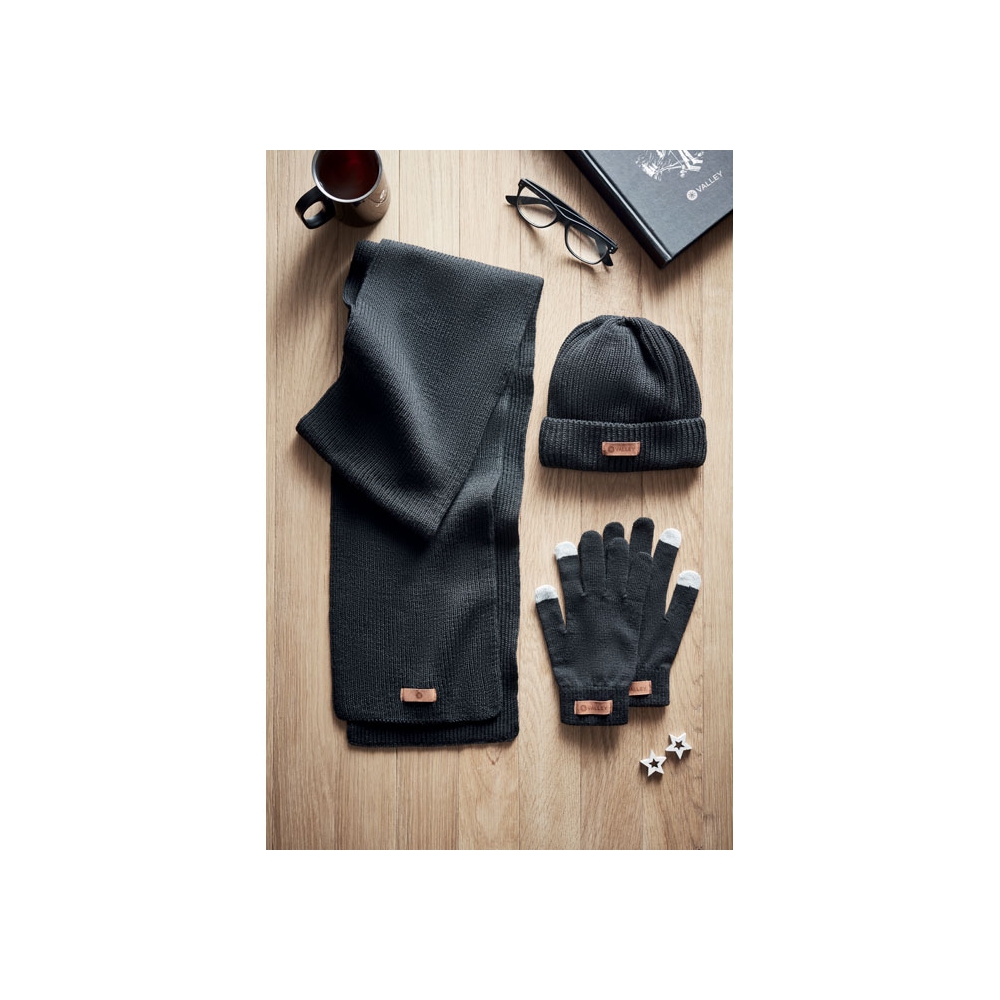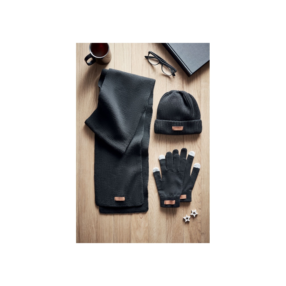 3-teilige Winter-Accessoires. Inklusive Mütze, Schal und taktilen Handschuhen aus RPET. Mit Label zur Werbeanbringung.