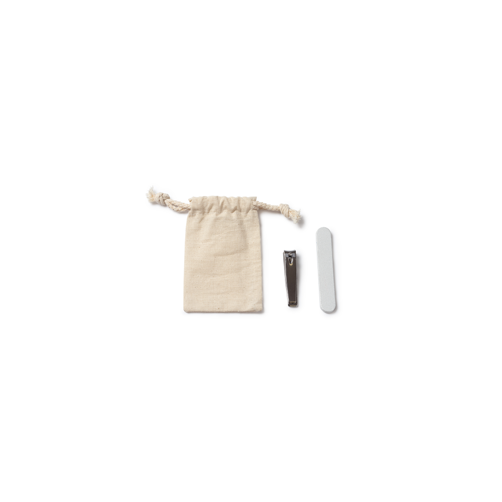 Maniküreset in einem Kordelzug-Beutel aus Baumwolle. Beinhaltet: Nagelfeile und Nagelknipser.