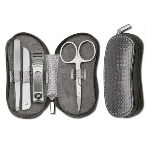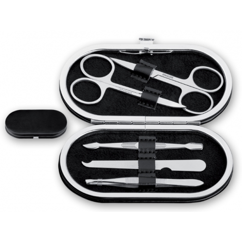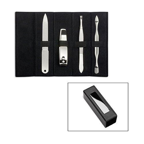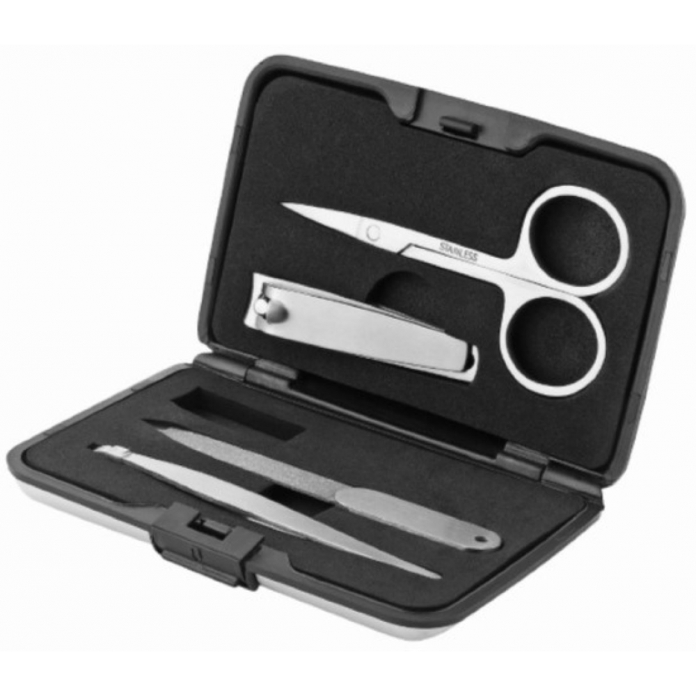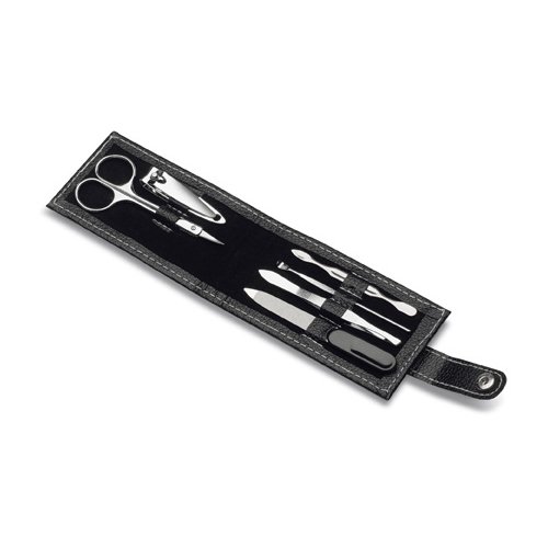 Maniküre Set (5teilig) bestehend aus einer Nagelfeile, einer Nagelschere, einer Nagelzange, einer Pinzette und einem Nagelhautschieber. Geliefert in einem Etui aus PU. 110 x 65 x 20 mm
