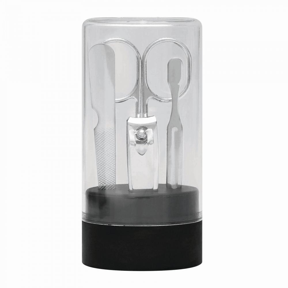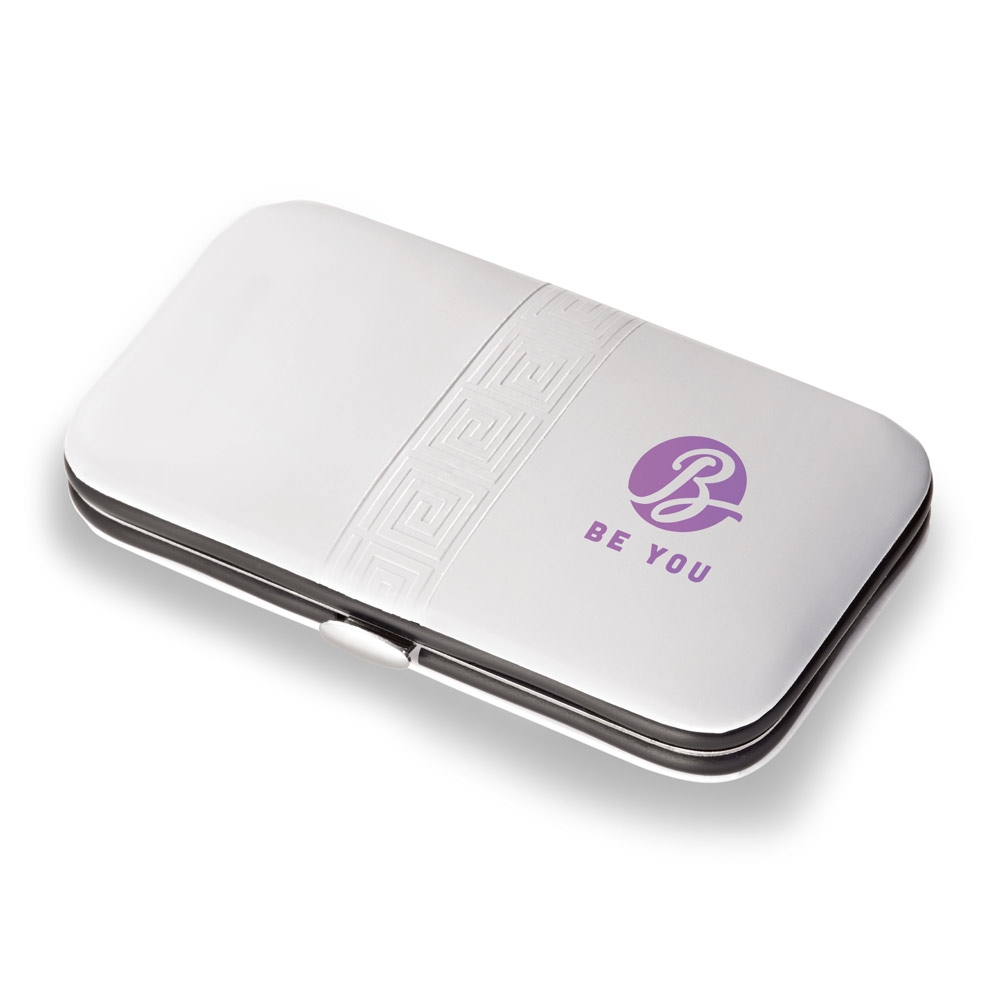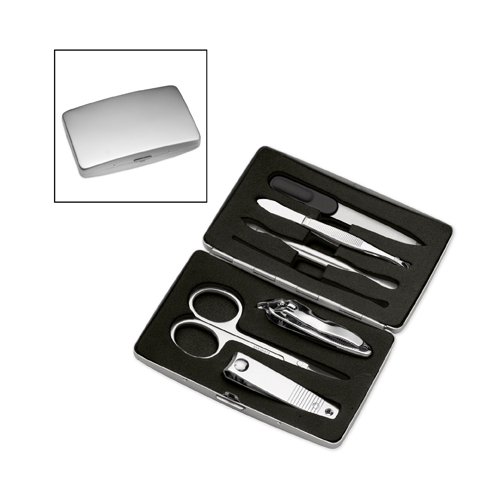 Ob auf Reisen oder zuhause, das Maniküre-Set mit sieben Utensilien zur Nagelpflege ist in einem Aluminiumetui untergebracht. Es enthält Nagelfeile, Nagelschere, Nagelknipser, Pinzette und Nagelhautschieber. Veredelbar ist das Etui mit einer dezenten Lasergravur oder einem einfarbigen Tampondruck.