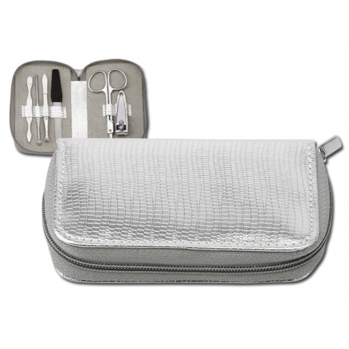 Wer gern verreist, der wird dieses Reisenecessaire mit Schere, Nagelknipser, Nagelfeile und Nagelhautschieber besonders lieben. Kunstleder/Metall, silber, Magnetverschluss, Nagelfeile, Nagelhautschieber, Nagelknippser, Nagelschere, Pinzette, REFLECTS Verpackung