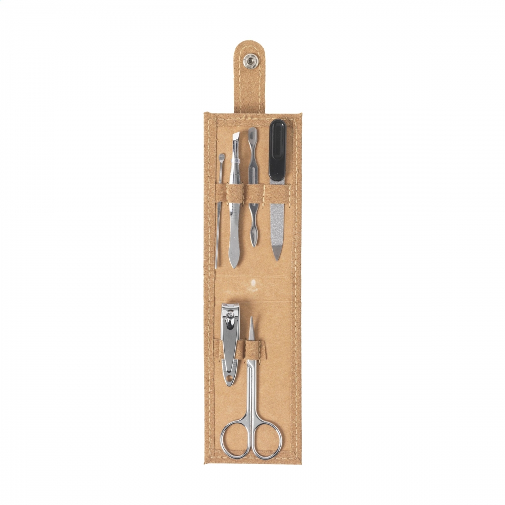 Maniküreset ELAINE CORK, 6-teilig: bestehend aus Nagelschere, Nagelfeile, Pinzette, Nagelknipser, Ohrenstäbchen und Nagelschaber, im Korkdruckknopfetui, in Box