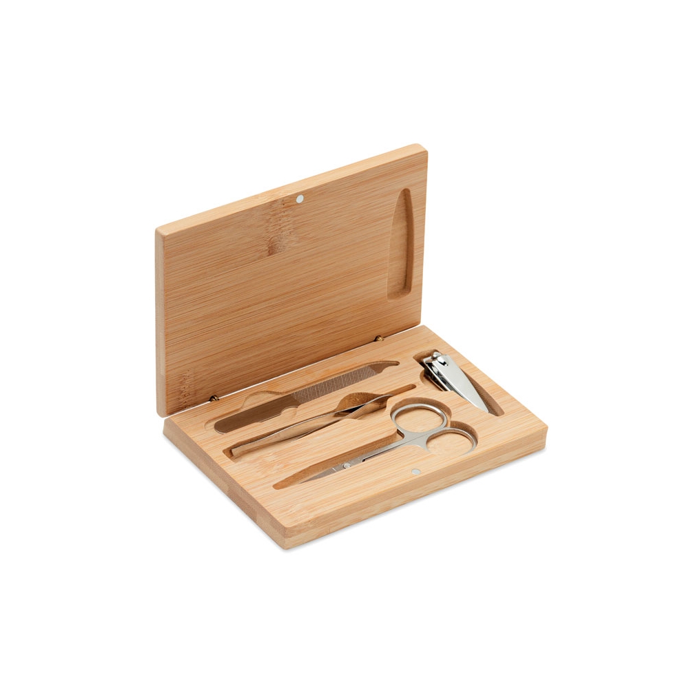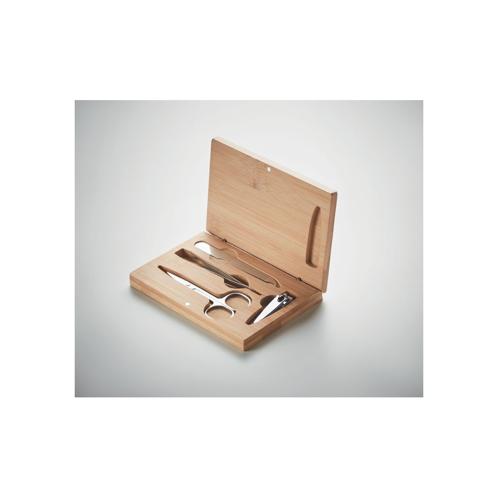 Manikürset in einem Bambusetui mit Magnetverschluß bestehend aus einer Feile, Nagelschere, Nagelknipser und Nagelhautschieber. Ihre Werbung wird auf die Verpackung graviert.