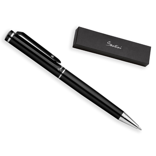 Luxuriöser Drehkugelschreiber der Marke Ferraghini mit schwarzer Lackoberfläche und Flechtmuster in Stoff mit vereinzelten Chromakzenten. Aufbewahrt wird der blau schreibende Metallkugelschreiber (Großraummine) in einem mit Velours ausgelegtem Kunstlederetui mit Magnetverschluss. Ihre Werbung lasern wir auf den Kugelschreiber neben dem Clip.