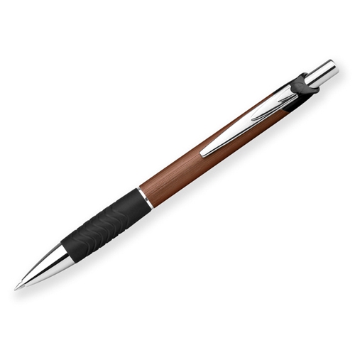 Metallkugelschreiber mit silber verchromten Enden und Lederapplikationen. Mit passender Aluminiumbox. Schwarze Tinte.