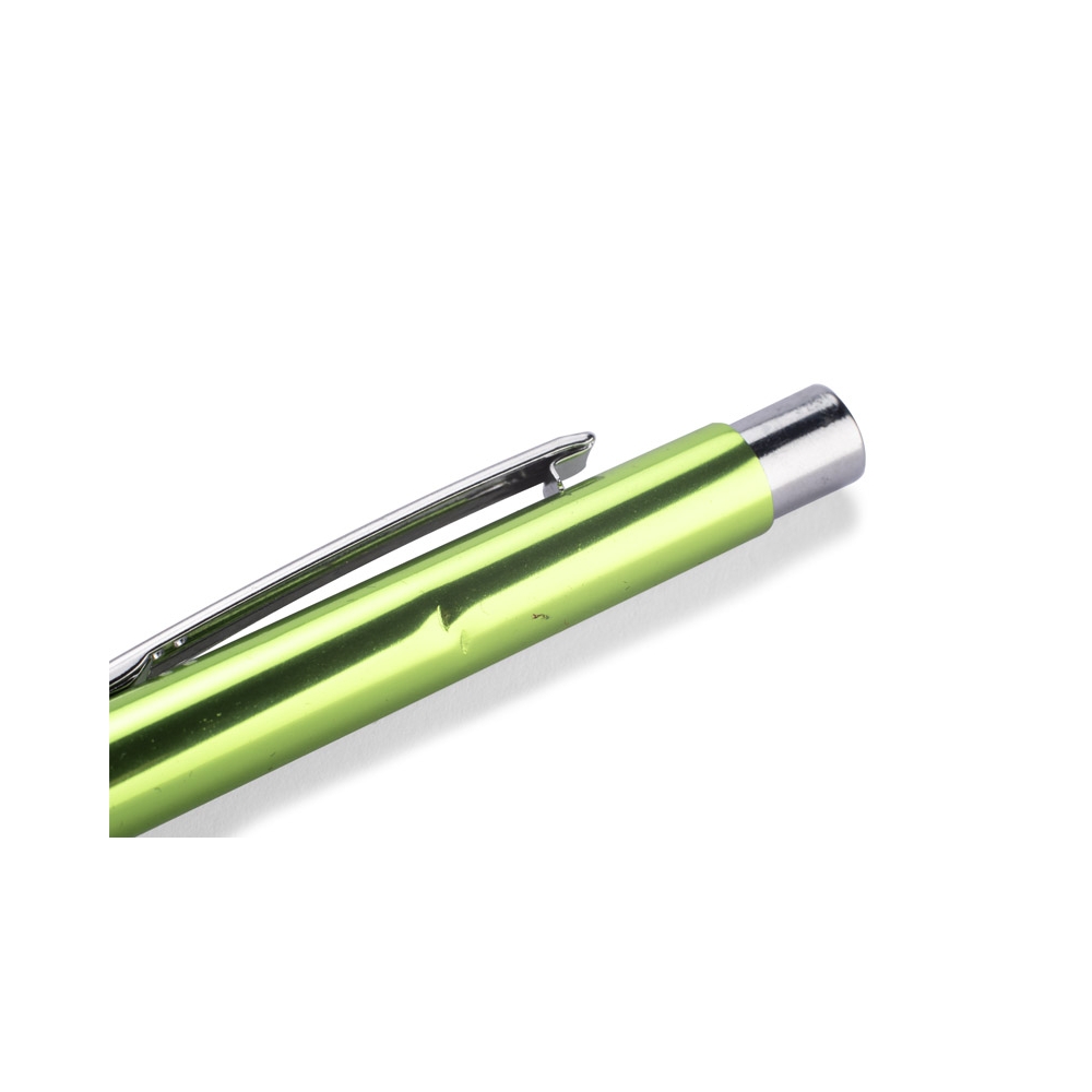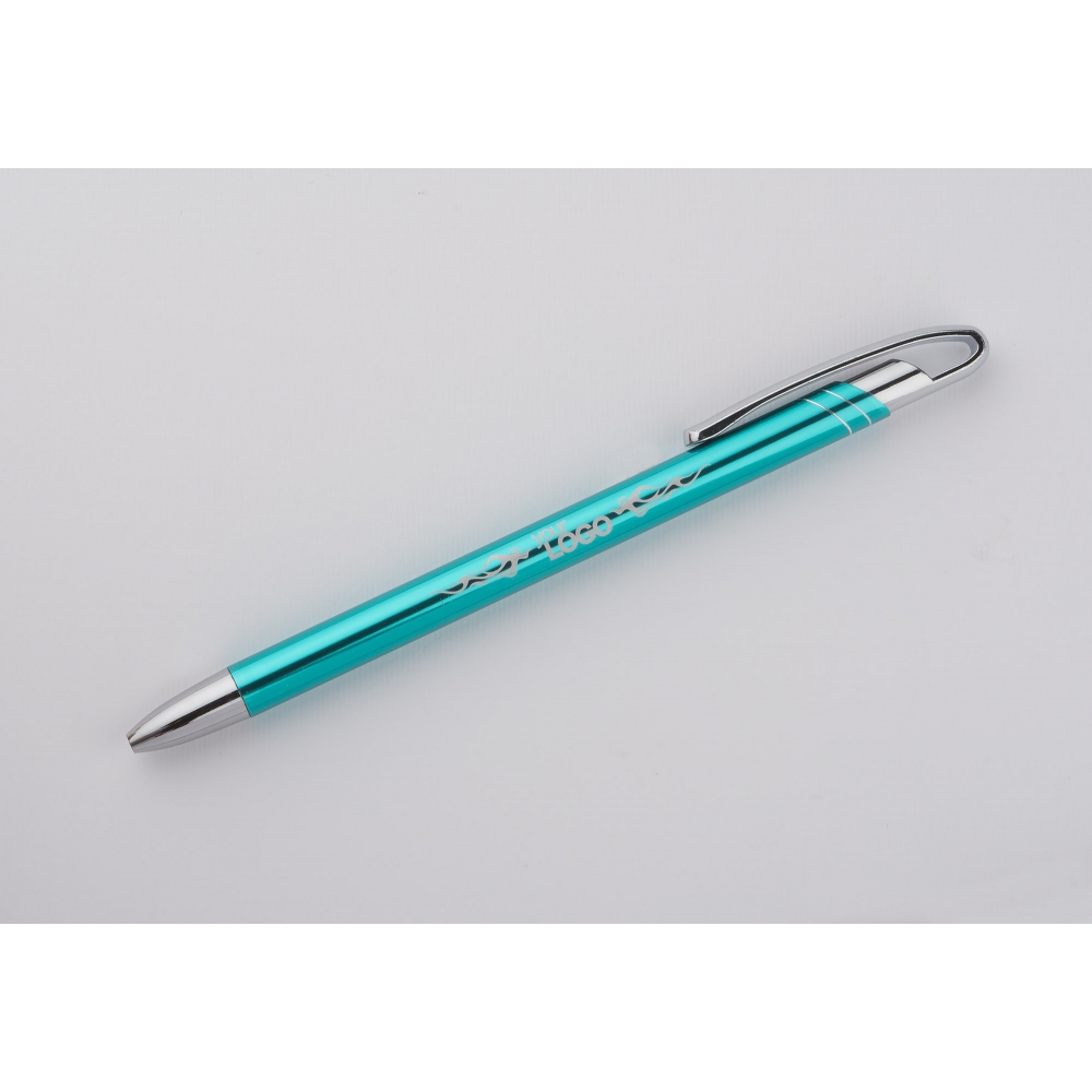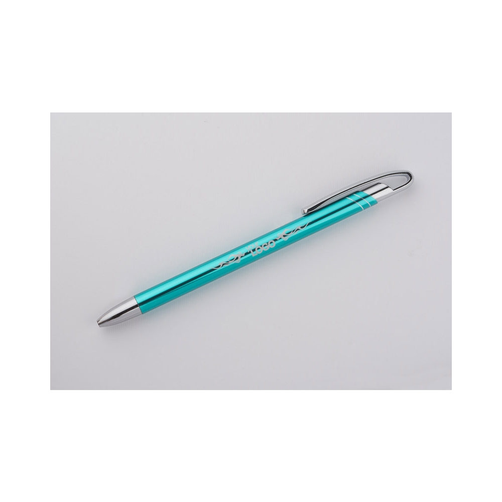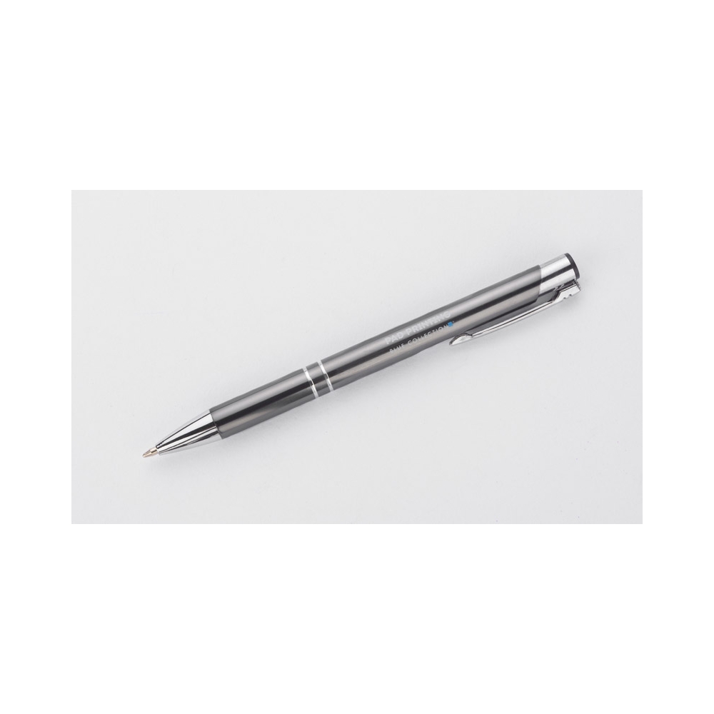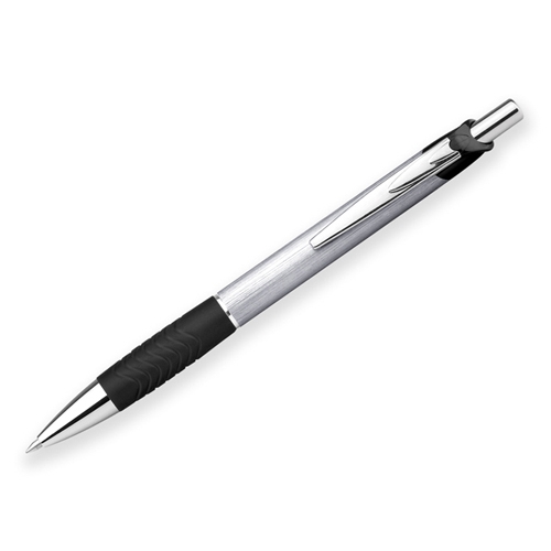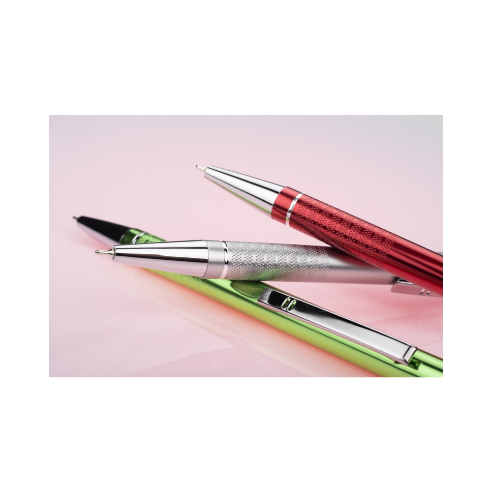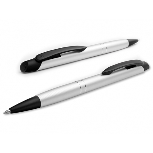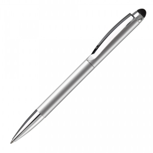 Metallkugelschreiber aus Aluminium mit gummiertem Schaftende für die Touchscreensteuerung und integrierter Kugelschreibermine im Drücker, welches sich durch einfaches Umdrehen des Kugelschreibers in Schreibstellung bringt. Gehäuse in silber.