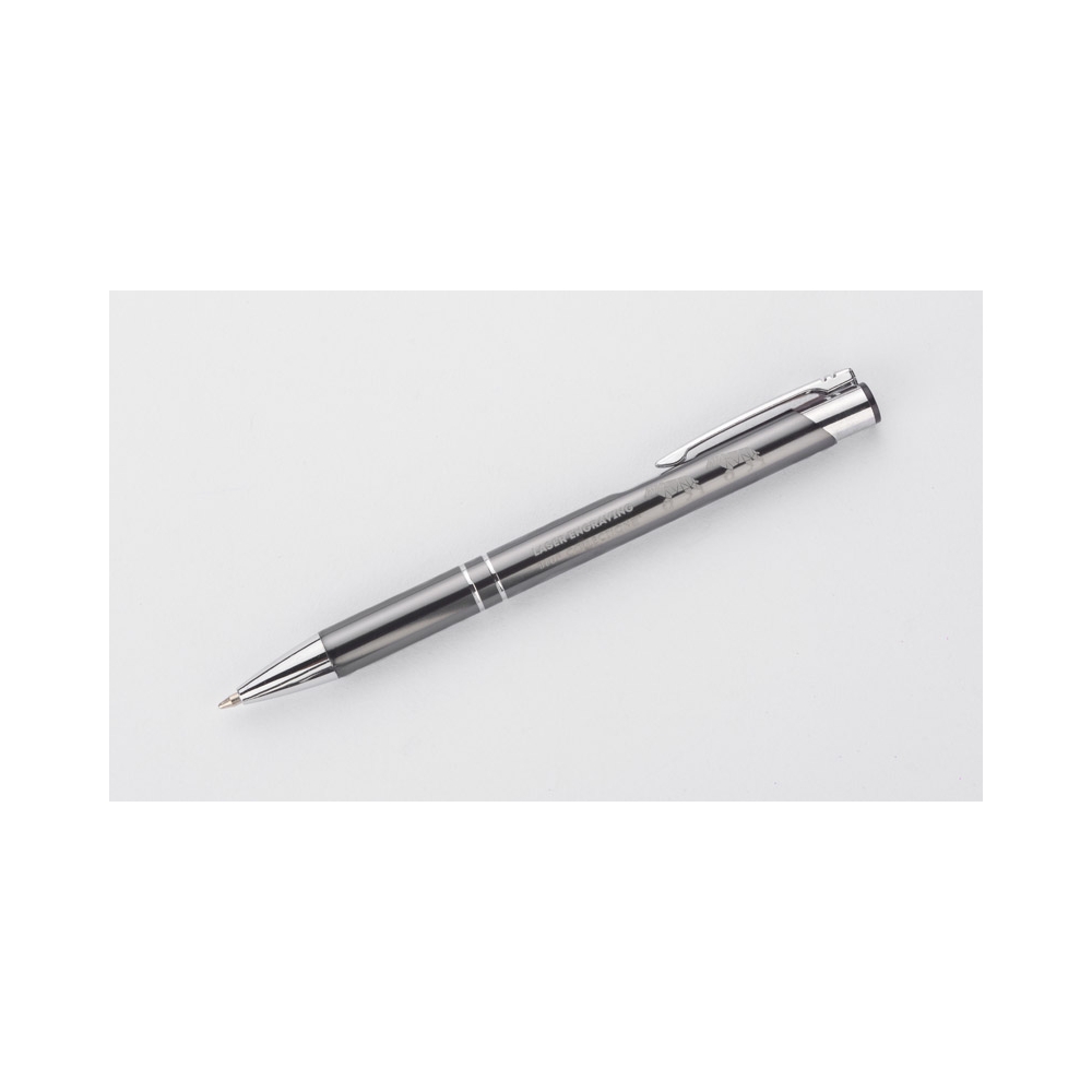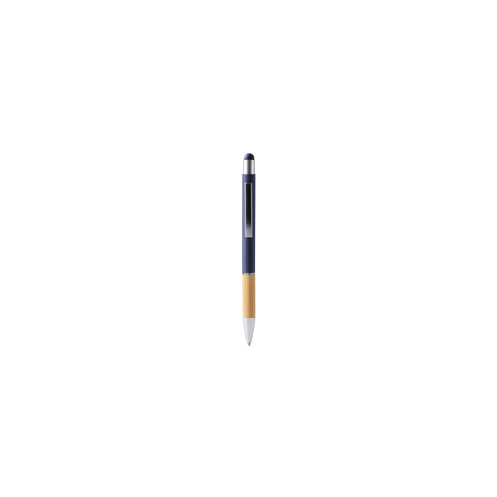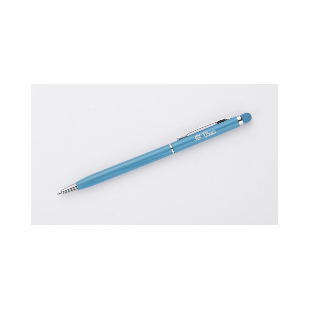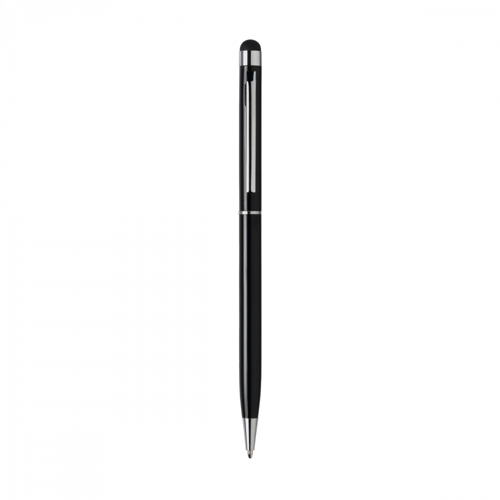 Drehkugelschreiber aus Metall in klassischem Design mit blau schreibender Großraummine und einem Touch Pad. Ihre Werbung lasern wir neben den Metallclip.