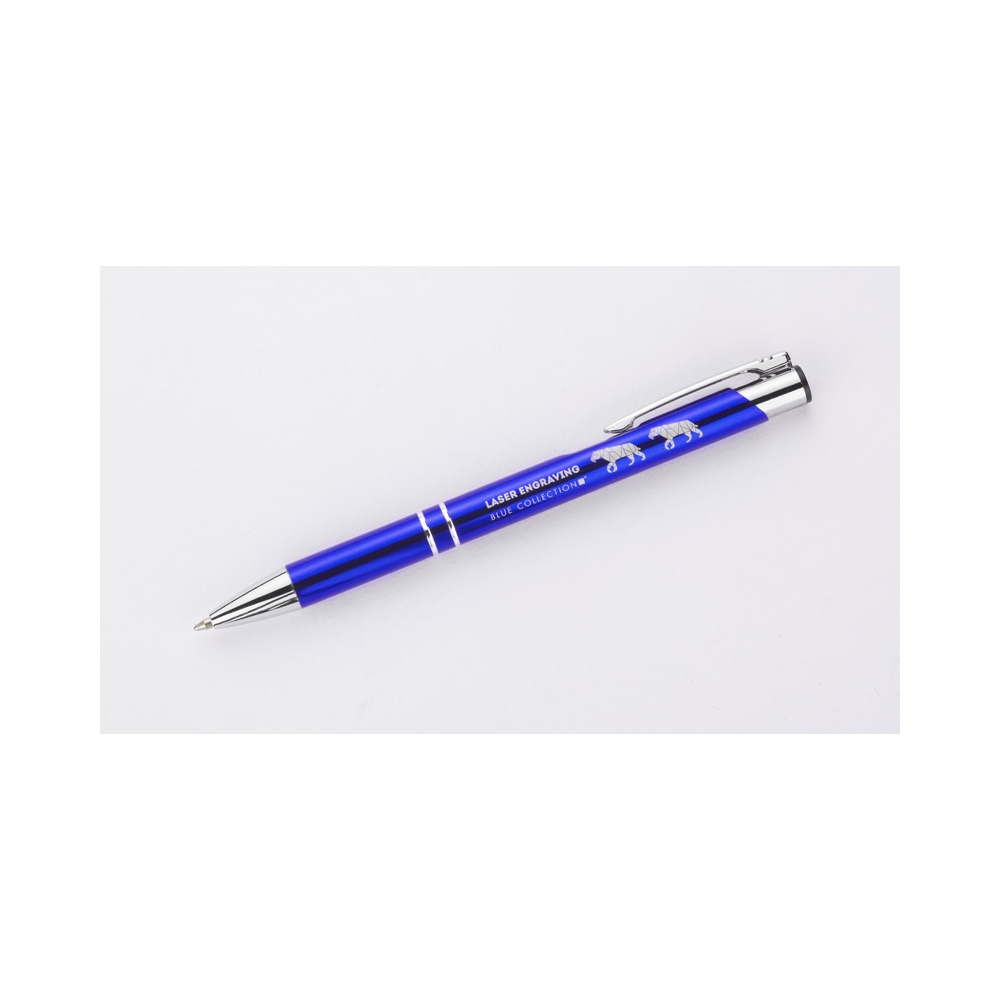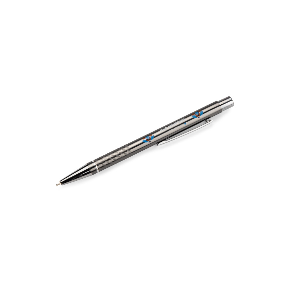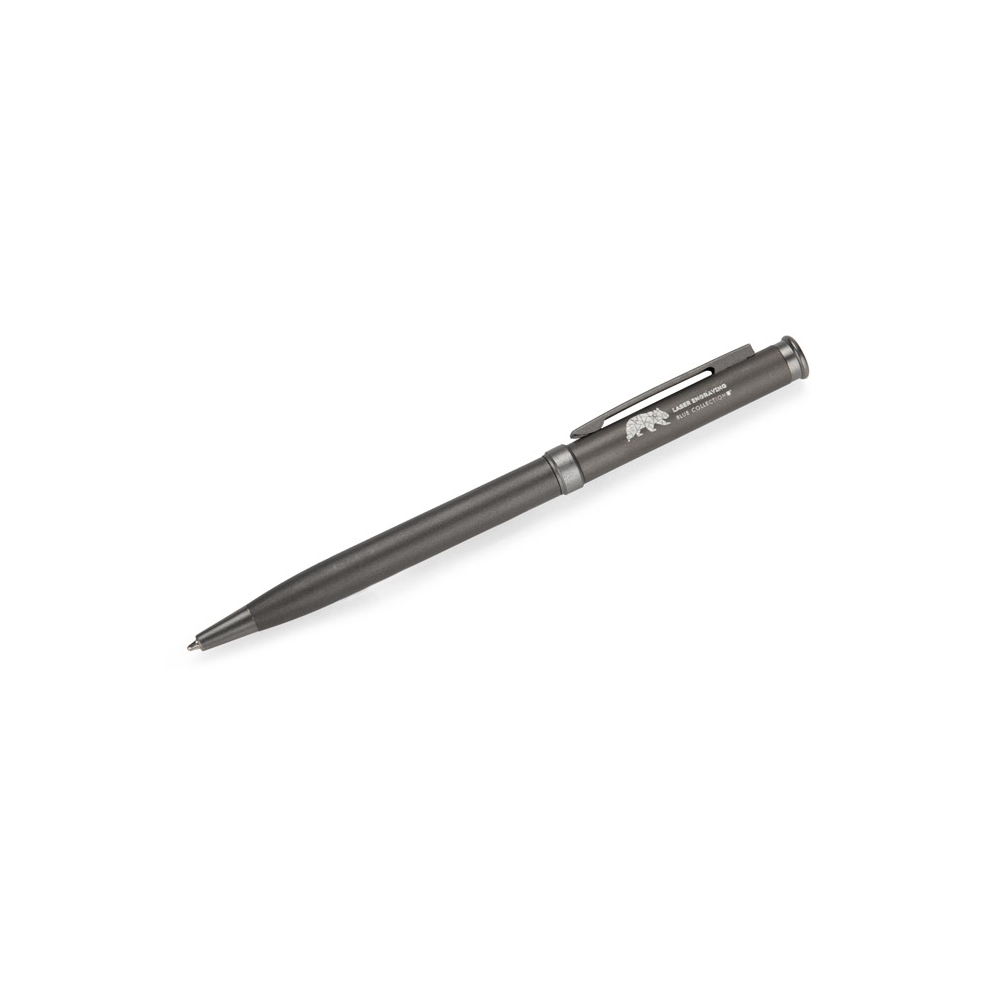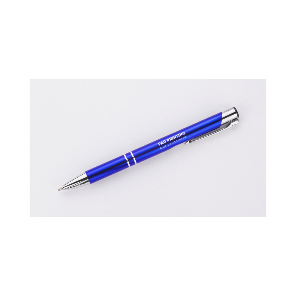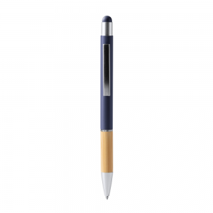 Drehkugelschreiber aus Metall in klassischem Design mit blau schreibender Großraummine und einem Touch Pad. Ihre Werbung lasern wir neben den Metallclip.