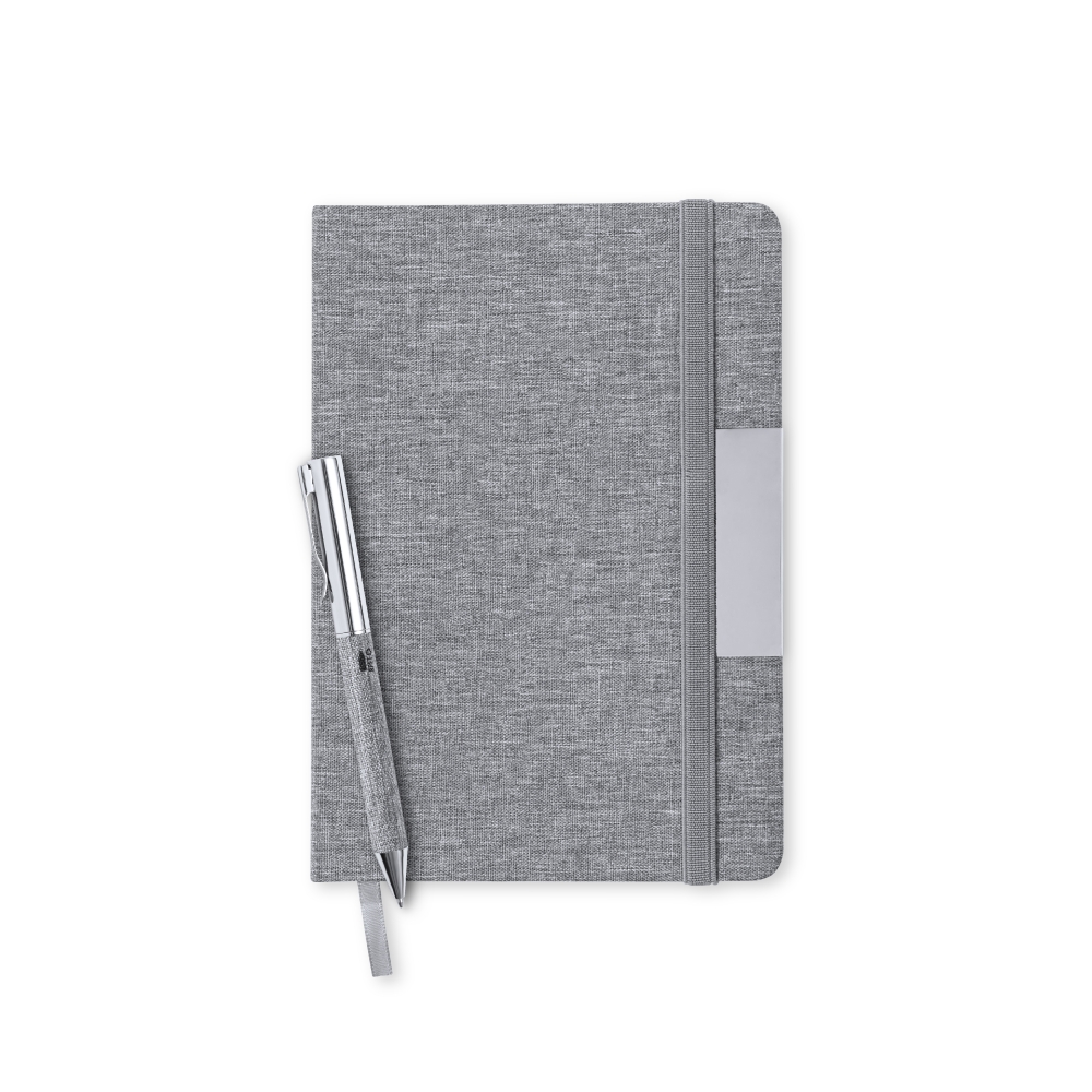 Mit 300D RPET-Polyester überzogenes Notizbuch mit 100 linierten Blättern und Gummiband. Inklusive eines mit RPET-Polyester überzogenen Metallkugelschreibers, blauschreibend. Größe A5.